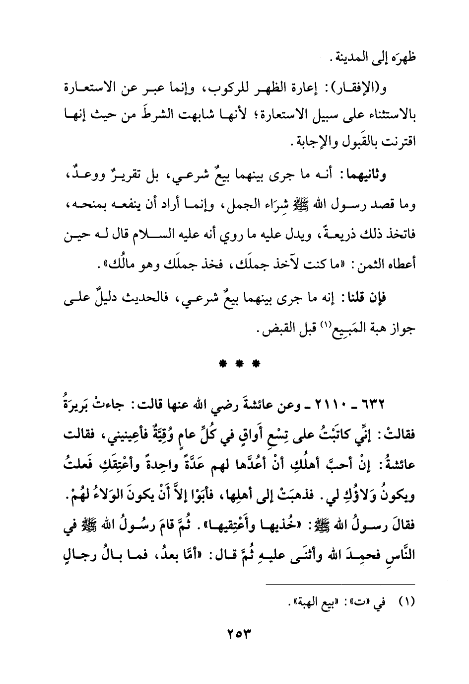 632 - 2110 - وعن عائشة رضي الله عنها قالت: جاءت بريرة فقالت: إني كاتبت على تسع أواق في كل عام وقية فأعينيني, فقالت عائشة: إن أحب أهلك أن أعدها لهم عدة واحدة وأعتقك فعلت ويكون ولاؤك لي: فذهبت إلى أهلها, فأبوا إلا أن يكون الولاء لهم: فقال رسول الله صلى الله عليه وسلم: " خذيها وأعتقيها ". ثم قام رسول الله صلى الله عليه وسلم في الناس فحمد الله وأثنى عليه ثم قال: " أما بعد, فما بال رجال