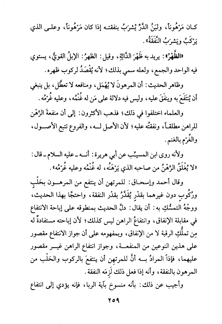 كان مرهونا, ولبن الدر يشرب بنفقته إذا كان مرهونا, وعلى الذي يركب ويشرب النفقة ".