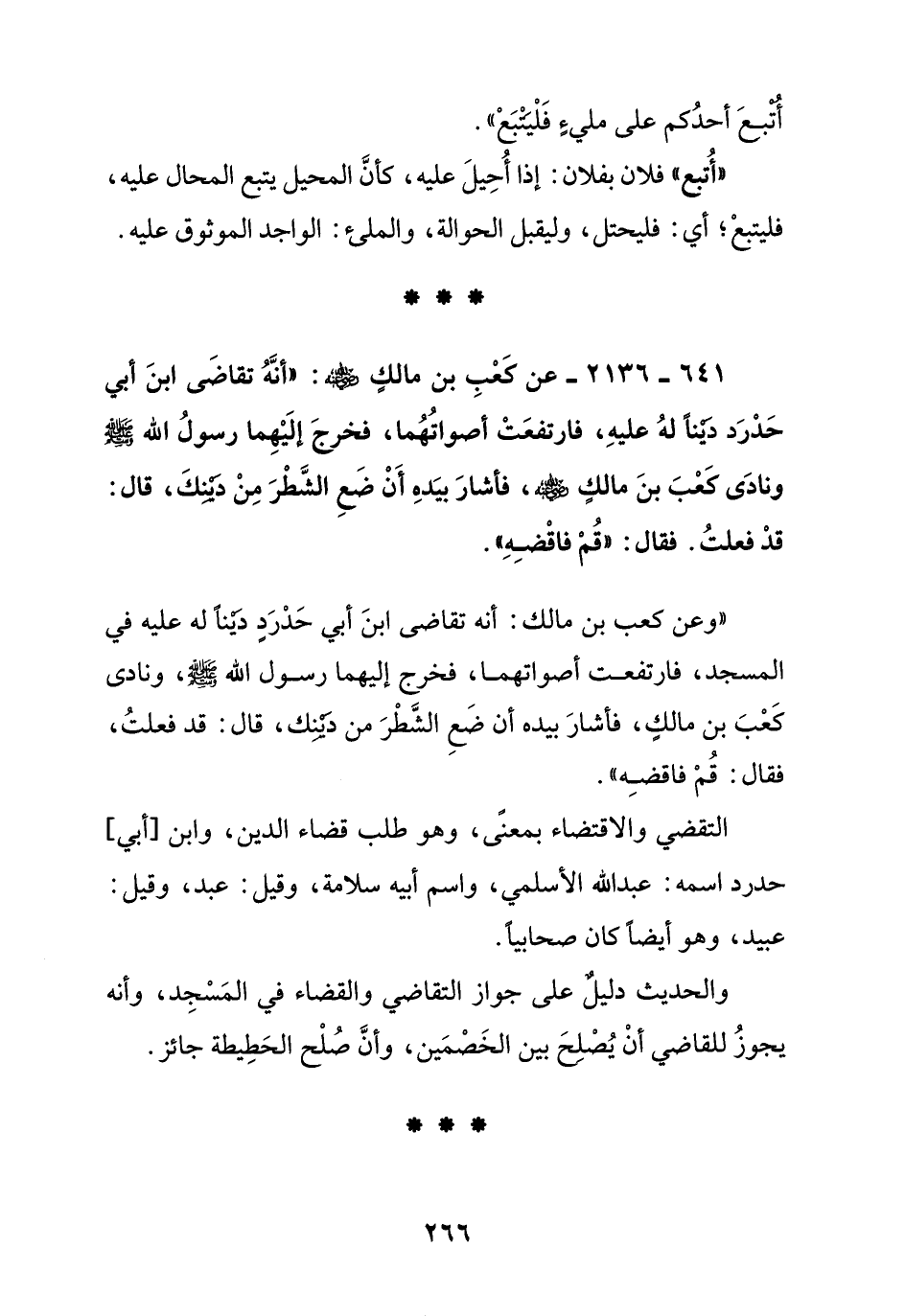 641 - 2136 - عن كعب بن مالك رضي الله عنه: " أنه تقاضى ابن أبي حدرد دينا له عليه, فارتفعت أصواتهما, فخرج إليهما رسول الله صلى الله عليه وسلم ونادى كعب بن مالك رضي الله عنه, فأشار بيده أن ضع الشطر من دينك, قال: قد فعلت, فقال: " قم فاقضه ".