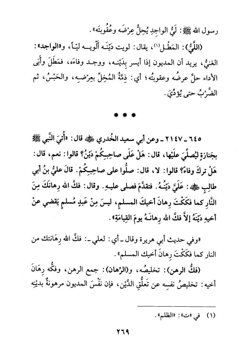 645 - 2147 - وعن أبي سعيد الخدري رضي الله عنه قال: " أتي النبي صلى الله عليه وسلم بجنازة ليصلي عليها, قال: هل على صاحبكم دين؟ قالوا: نعم, قال: هل ترك وفاء؟ قالوا: لا قال: صلوا على صاحبكم, قال علي بن أبي طالب رضي الله عنه: علي دينه, فتقدم فصلى عليه, وقال: فك الله رهانك من النار كما فككت رهان أخيك المسلم, ليس من عبد مسلم يقضي عن أخيه دينه إلا فك الله رهانه يوم القيامة ".