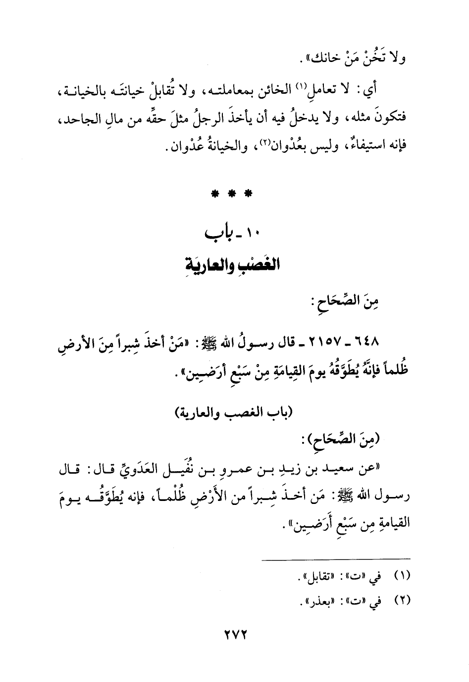 648 - 2157 - قال رسول الله صلى الله عليه وسلم: " من أخذ شبرا من الأرض ظلما فإنه يطوقه يوم القيامة من سبع أرضين ".