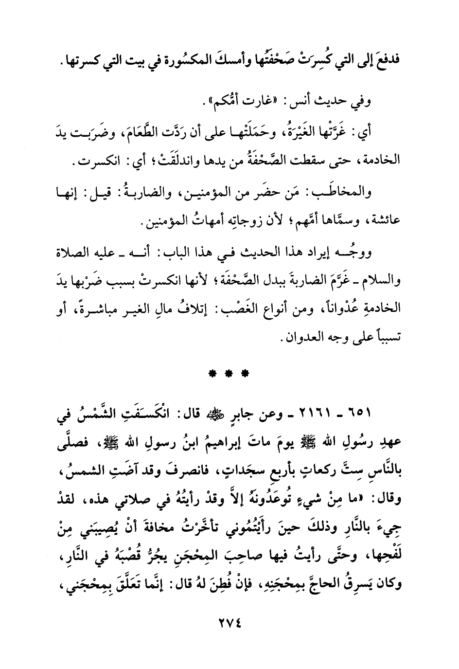651 – 2161 – وعن جابر رضي الله عنه قال: انكسفت الشمس في عهد رسول الله صلى الله عليه وسلم يوم مات إبراهيم ابن رسول الله صلى الله عليه وسلم, فصلى بالناس ست ركعات بأربع سجدات, فانصرف وقد آضت الشمس, وقال: " ما من شيء توعدونه إلا وقد رأيته في صلاتي هذه, لقد جيء بالنار وذلك حين رأيتموني تأخرت مخافة أن يصيبني من لفحها, وحتى رأيت فيها صاحب المحجن يجر قصبه في النار, وكان يسرق الحاج بمحجنه, فإن فطن له قال: إنما تعلق بمحجني