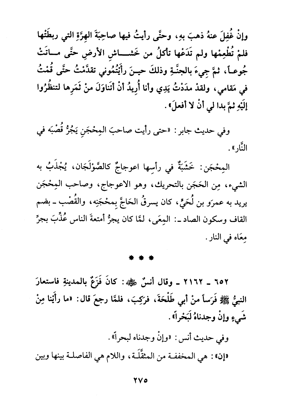 وإن غفل عنه ذهب به, وحتى رأيت فيها صاحبة الهرة التي ربطتها فلم تطعمها ولم تدعها تأكل من خشاش الأرض حتى ماتت جوعا, ثم جيء بالجنة وذلك حين رأيتموني تقدمت حتى قمت في مقامي, ولقد مددت يدي وأنا أريد أن أتناول من ثمرها لتنظروا إليه ثم بدا لي أن لا أفعل ".