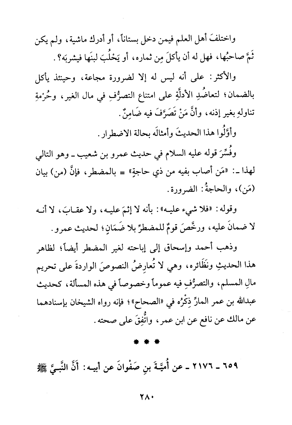 وفسر قوله عليه السلام في حديث عمرو بن شعيب – وهو التالي لهذا -:" من أصاب بفيه من ذي حاجة = بالمضطر, فإن (من) بيان (من) , والحاجة: الضرورة وقوله: " فلا شيء عليه ": بأنه لا إثم عليه, ولا عقاب, لا أنه لا ضمان عليه, ورخص قوم للمضطر بلا ضمان, لحديث عمرو.