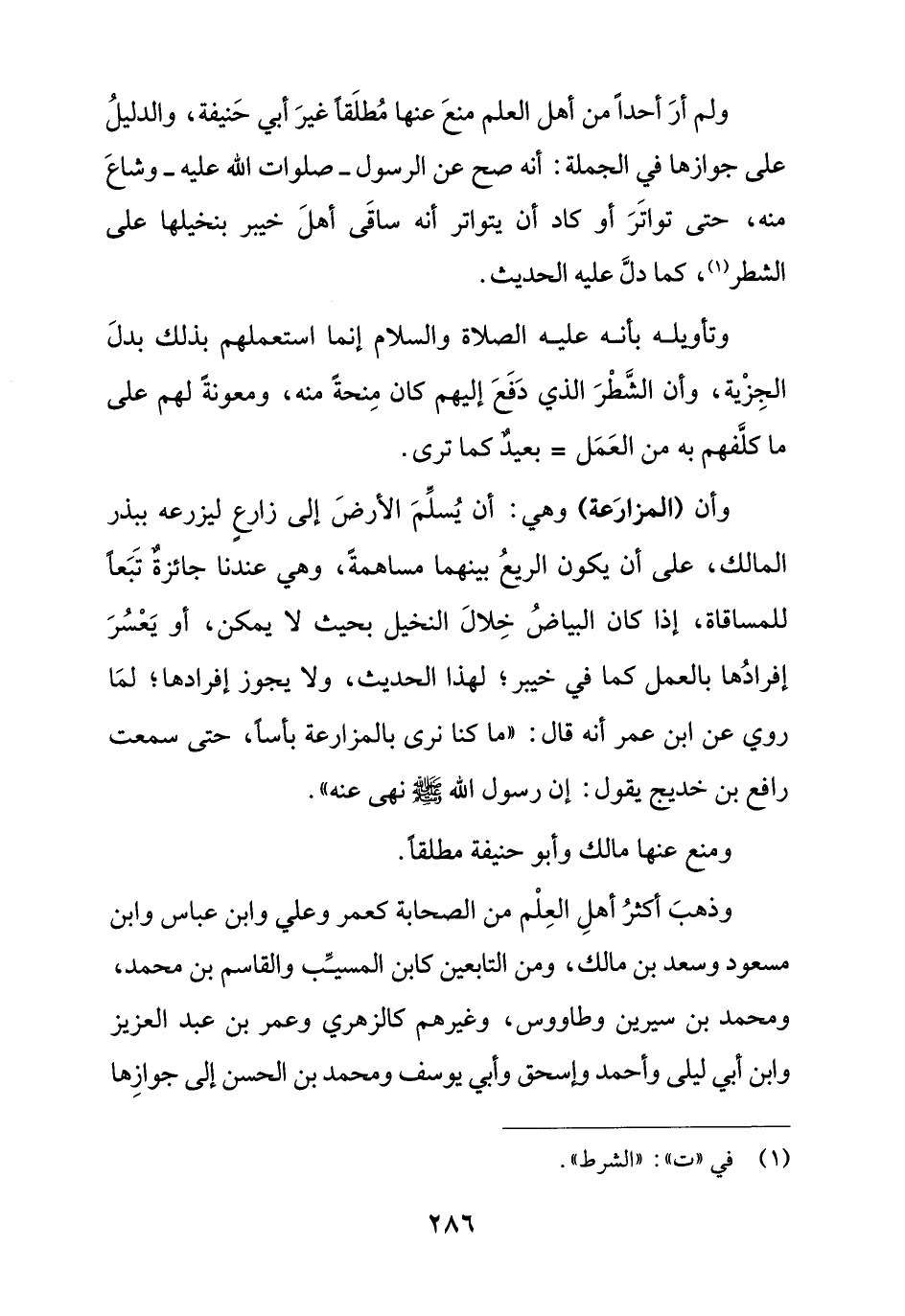 ولم أر أحدا من أهل العلم منع عنها مطلقا غير أبي حنيفة, والدليل على جوازها في الجملة: أنه صح عن الرسول - صلوات الله عليه - وشاع منه حتى تواتر أو كاد أن يتواتر أنه ساقي أهل خيبر بنخليهما على الشطر كما دل عليه الحديث.