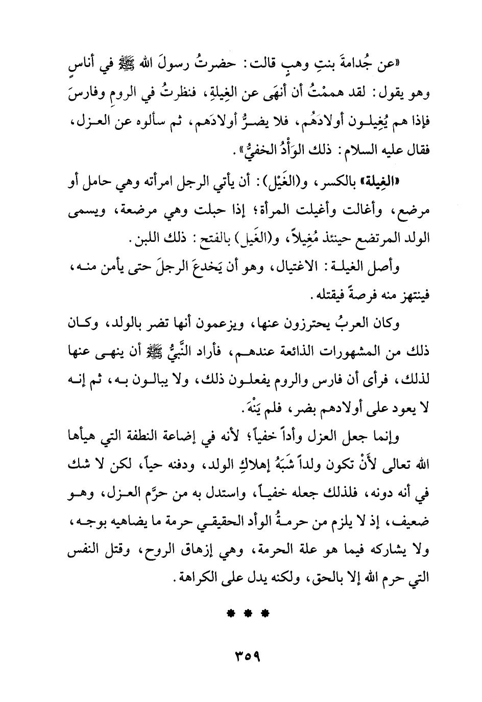 " عن جدامة بنت وهب قالت: حضرت رسول الله صلى الله عليه وسلم في أناس وهو يقول: لقد هممت أن أنهى عن الغيلة, فنظرت في الروم وفارس فإذا هم يغيلون أولادهم, فلا يضر أولادهم, ثم سألوه عن العزل, فقال عليه السلام: ذلك الوأد الخفي ".