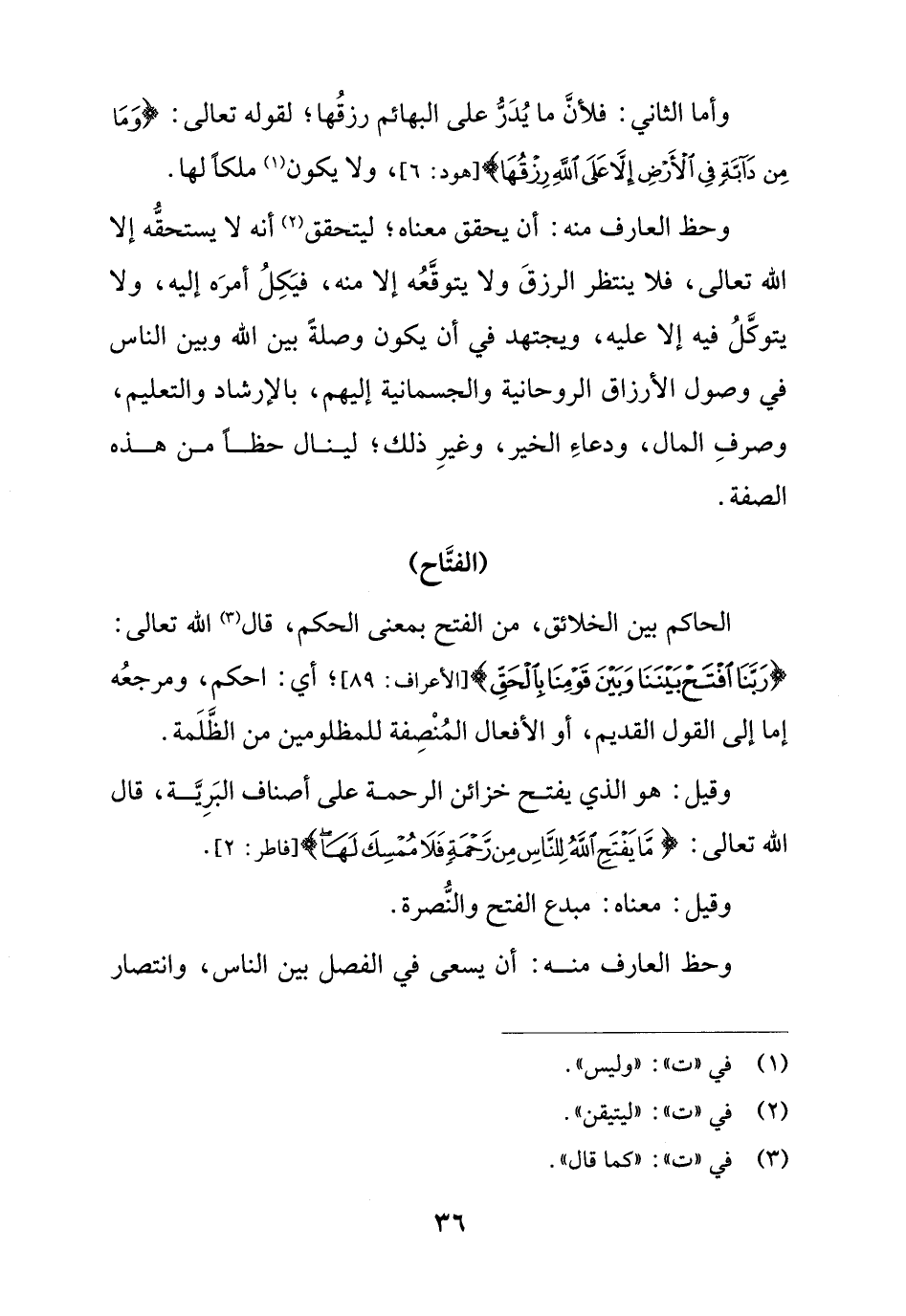 وحظ العارف منه: أن يحقق معناه: ليتحقق أنه لا يستحقه إلا الله تعالى, فلا ينتظر الرزق ولا يتوقعه إلا منه, فيكل أمره إليه, ولا يتوكل فيه إلا عليه, ويجتهد في أن يكون وصلة بين الله وبين الناس في وصول الأرزاق الروحانية والجسمانية إليهم, بالإرشاد والتعليم, وصرف المال, ودعاء الخير, وغير ذلك, لينال حظا من هذه الصفة.