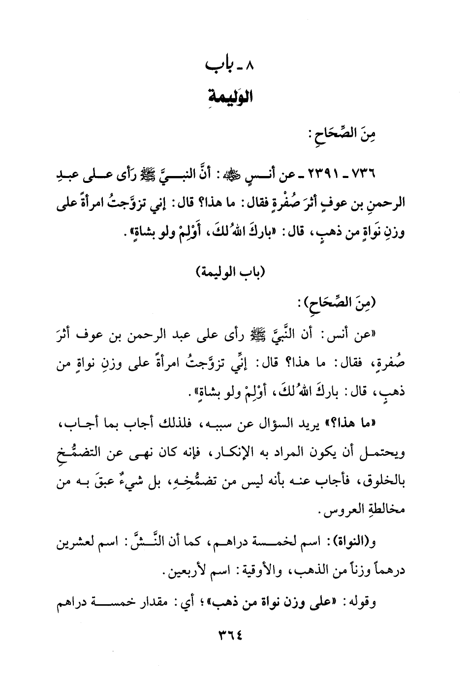 736 - 2391 - عن أنس رضي الله عنه: أن النبي صلى الله عليه وسلم رأى على عبد الرحمن بن عوف أثر صفرة فقال: ماهذا؟ قال: إني تزوجت امرأة على وزن نواة من ذهب, قال: " بارك الله لك, أولم ولو بشاة ".