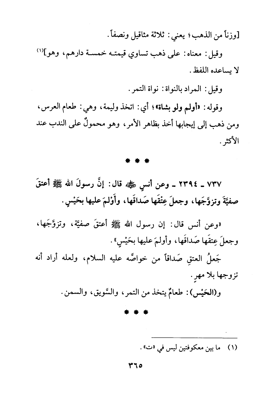 737 - 2394 - وعن أنس رضي الله عنه قال: إن رسول الله صلى الله عليه وسلم أعتق صفية وتزوجها, وجعل عتقها صداقها, وأولم عليها بحيس ".