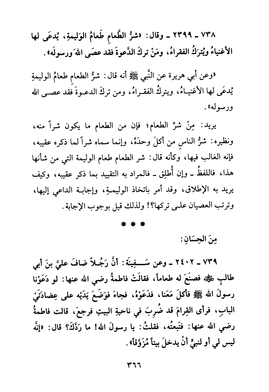 738 - 2399 - وقال: " شر الطعام طعام الوليمة, يدعى لها الأغنياء ويترك الفقراء, ومن ترك الدعوة فقد عصى الله ورسوله ".