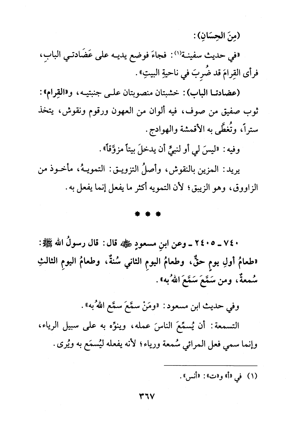 (عضادتا الباب): خشبتان منصوبتان على جنبتيه و" القرام": ثوب صفيق من صوف, فيه ألوان من العهون ورقوم ونقوش, يتخذ سترا وتغطى به الأقمشة والهوادج.