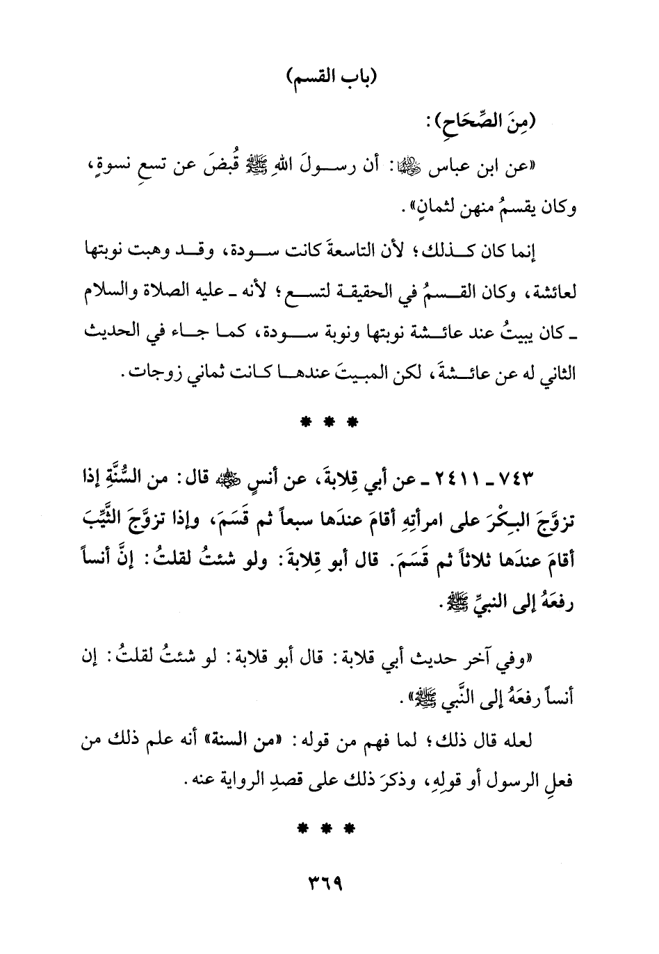 743 - 2411 - عن أبي قلابة, عن أنس رضي الله عنه قال: من السنة إذا تزوج البكر على امرأته أقام عندها سبعا ثم قسم, وإذا تزوج الثيب أقام عنده ثلاثا ثم قسم, قال أبو قلابة: ولو شئت لقلت: إن أنسا رفعه إلى النبي صلى الله عليه وسلم.