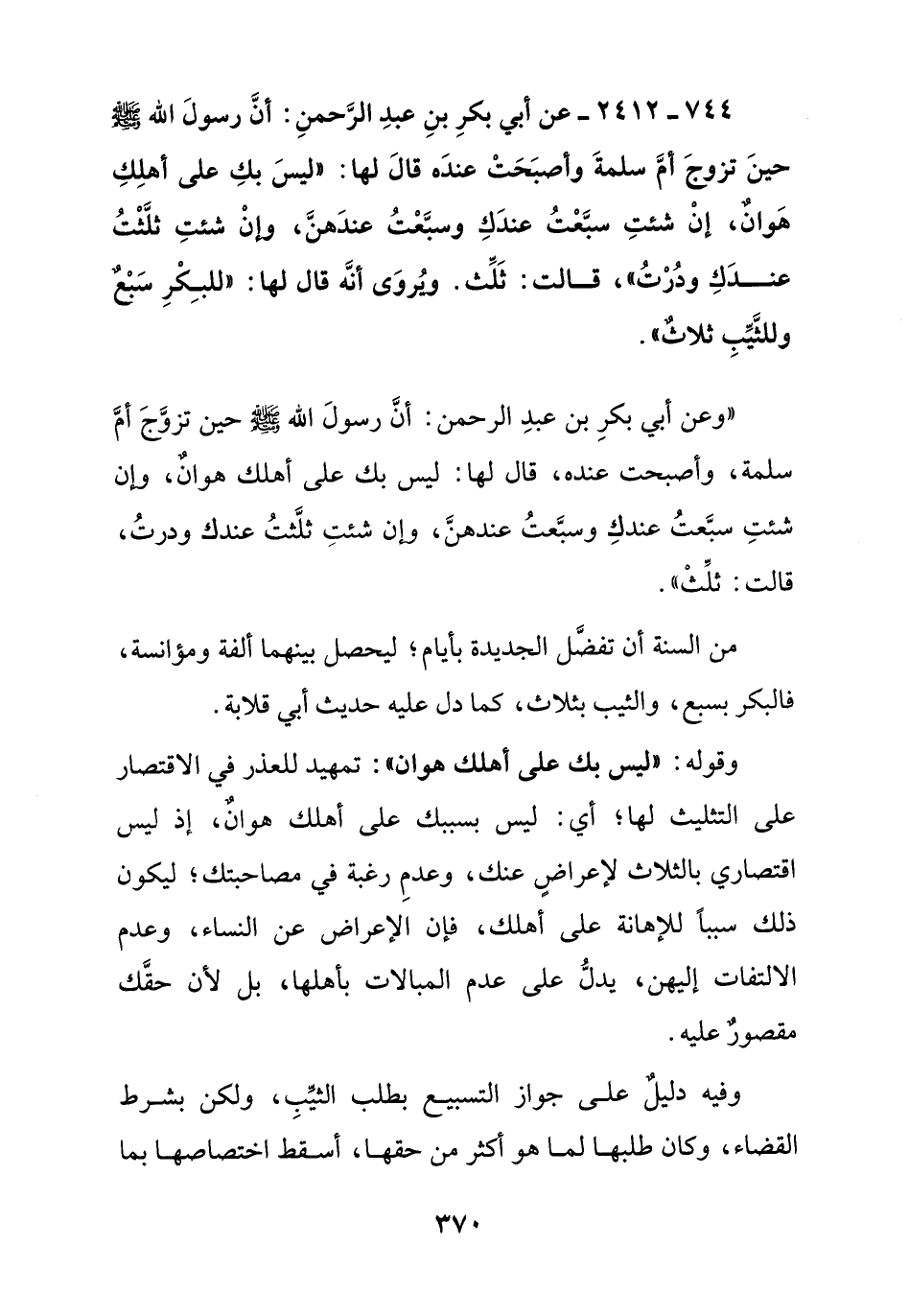744 - 2412 - عن أبي بكر بن عبد الرحمن: أن رسول الله صلى الله عليه وسلم حين تزوج أم سلمة وأصبحت عنده قال لها: " ليس بك على أهلك هوان, إن شئت سبعت عندك وسبعت عندهن, وإن شئت ثلثت عندك ودرت ", قالت: ثلث. ويروى أنه قال لها: " للبكر سبع وللثيب ثلاث ".