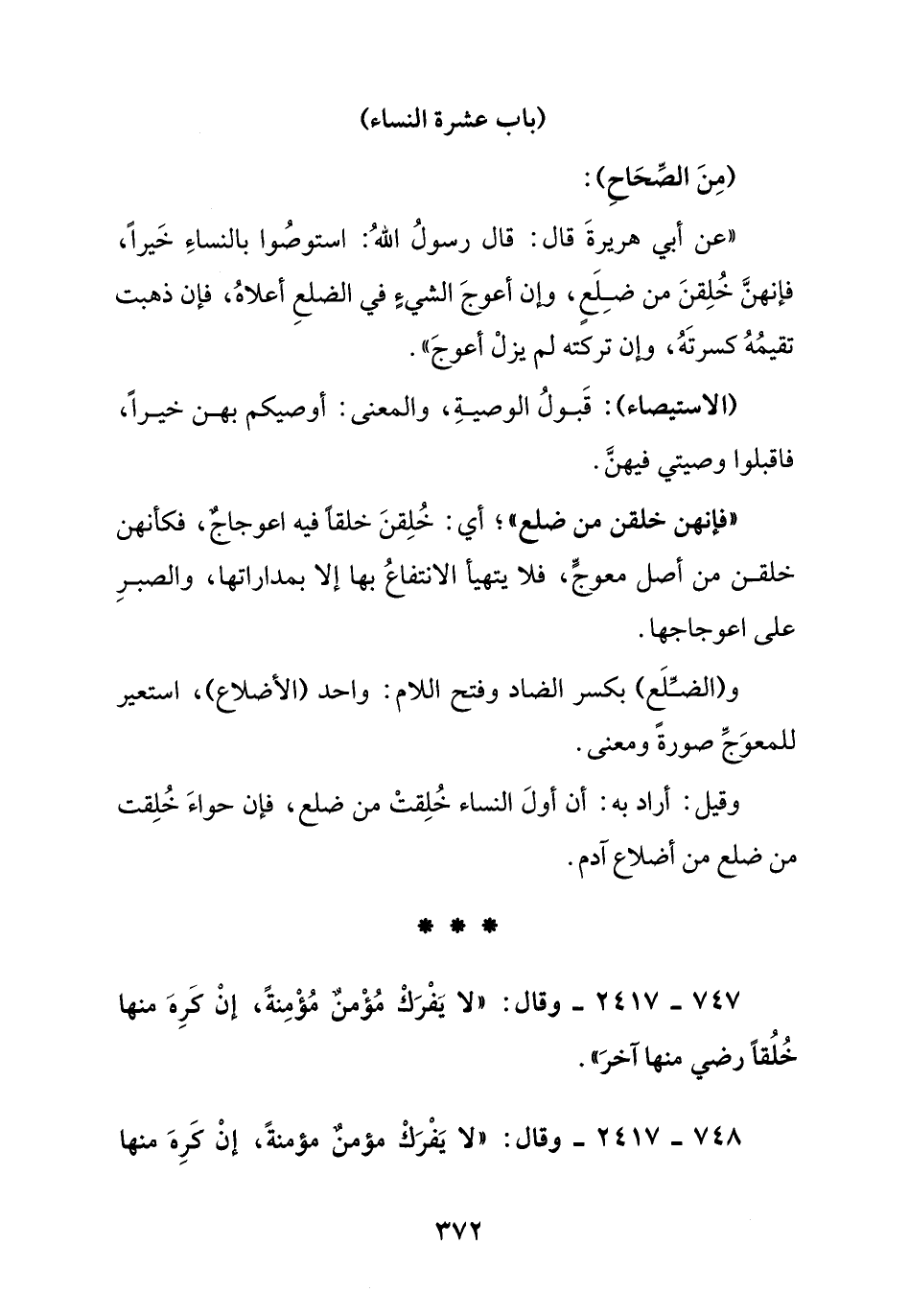 " عن أبي هريرة قال: قال رسول الله: استوصوا بالنساء خيرا, فإنهن خلقن من ضلع, وإن أعوج الشيء في الضلع أعلاه, فإن ذهبت تقيمه كسرته, وإن تركته لم يزل أعوج ".