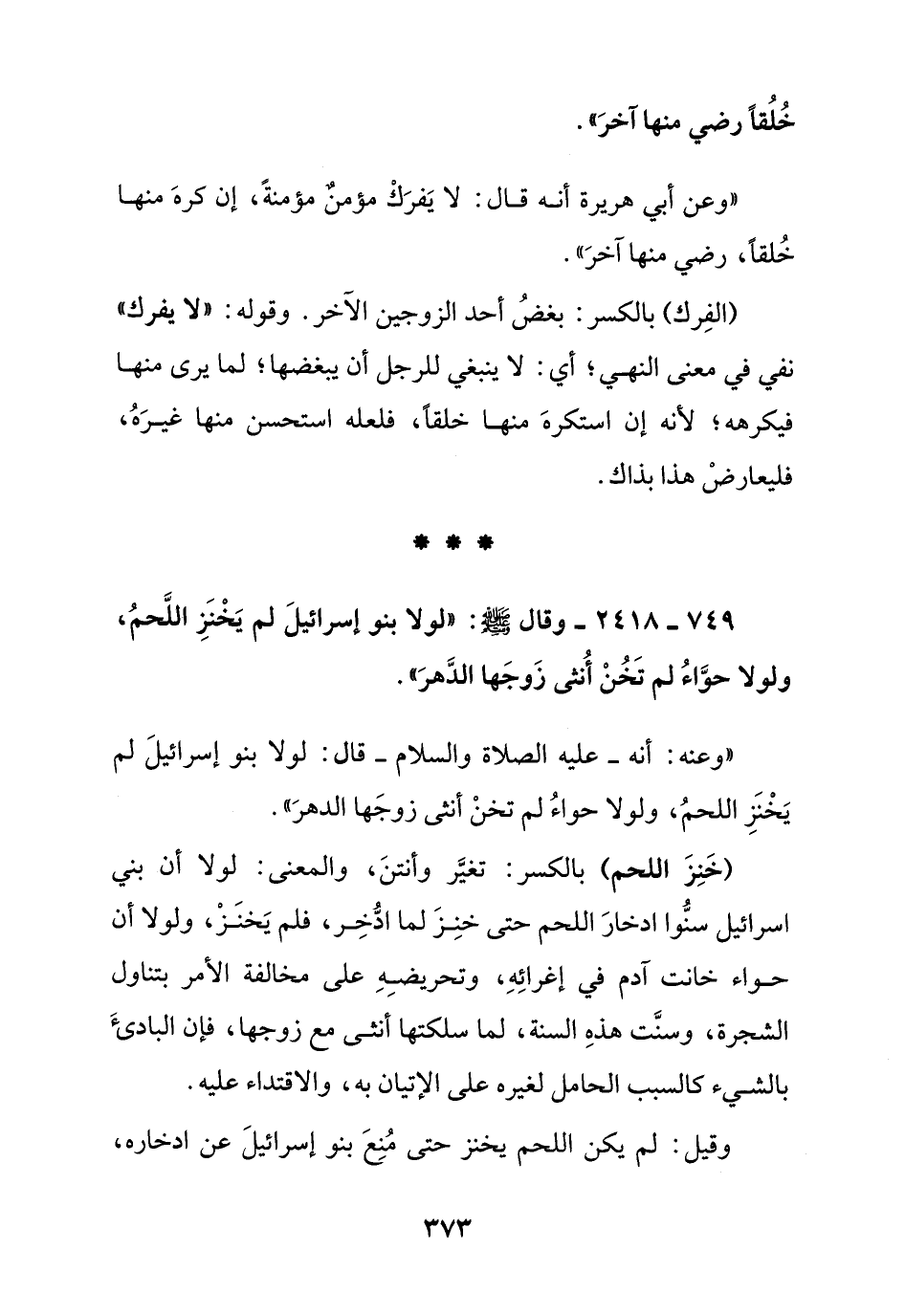 749 - 2418 - وقال صلى الله عليه وسلم: " لولا بنو إسرائيل لم يخنز اللحم, ولولا حواء لم تخن أنثى زوجها الدهر ".