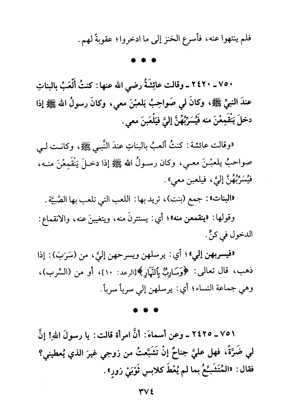 750 - 2420 - وقالت عائشة رضي الله عنها: كنت ألعب بالبنات عند النبي صلى الله عليه وسلم, وكان لي صواحب يلعبن معي, وكان رسول الله صلى الله عليه وسلم إذا دخل ينقمعن منه فيسربهن إلى فيلعبن معي.