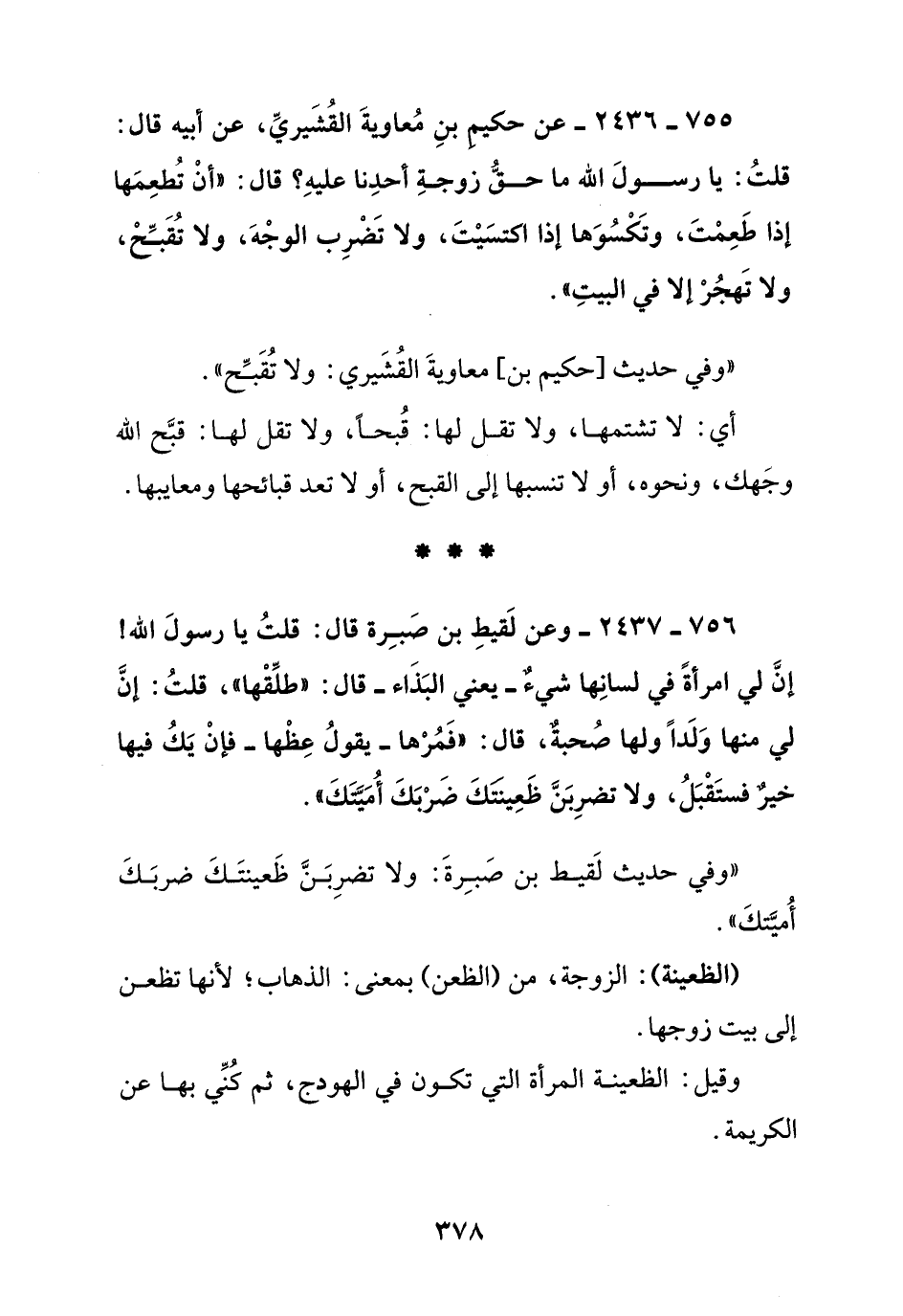755 - 2436 - عن حكيم بن معاوية القشيري, عن أبيه قال: قلت: يارسول الله ما حق زوجة أحدنا عليه؟ قال: " أن تطعمها إذا طعمت, وتكسوها إذا اكتسيت, ولا تضرب الوجه, ولا تقبح, ولا تهجر إلا في البيت "