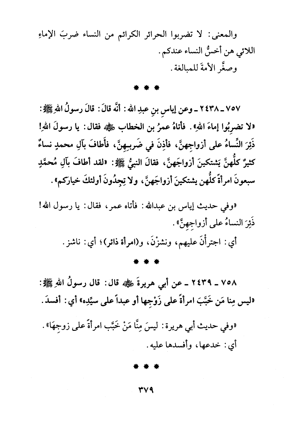 757 - 2438 - وعن إياس بن عبد الله: أنه قال: قال رسول الله صلى الله عليه وسلم: " لا تضربوا إماء الله " فأتاه عمر بن الخطاب رضي الله عنه فقال: يا رسول الله! ذئر النساء على أزواجهن, فأذن في ضربهن, فأطاف بآل محمد نساء كثير كلهن يشتكين أزواجهن, فقال النبي صلى الله عليه وسلم: " لقد أطاف بآل محمد سبعون امرأة كلهن يشتكين أزواجهن, ولا تجدون أولئك خياركم ".