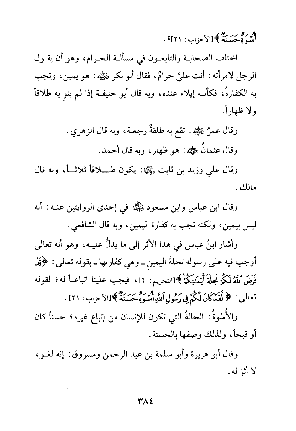 وأشار ابن عباس في هذا الأثر إلى ما يدل عليه, وهو أنه تعالى أوجب فيه على رسوله تحلة اليمين – وهي كفارتها – بقوله تعالى: {قد فرض الله لكم تحلة أيمانكم} [التحريم: 2] , فيجب علينا اتباعا له, لقوله تعالى: {لقد كان لكم في رسول الله أسوة حسنة} [الأحزاب: 21].