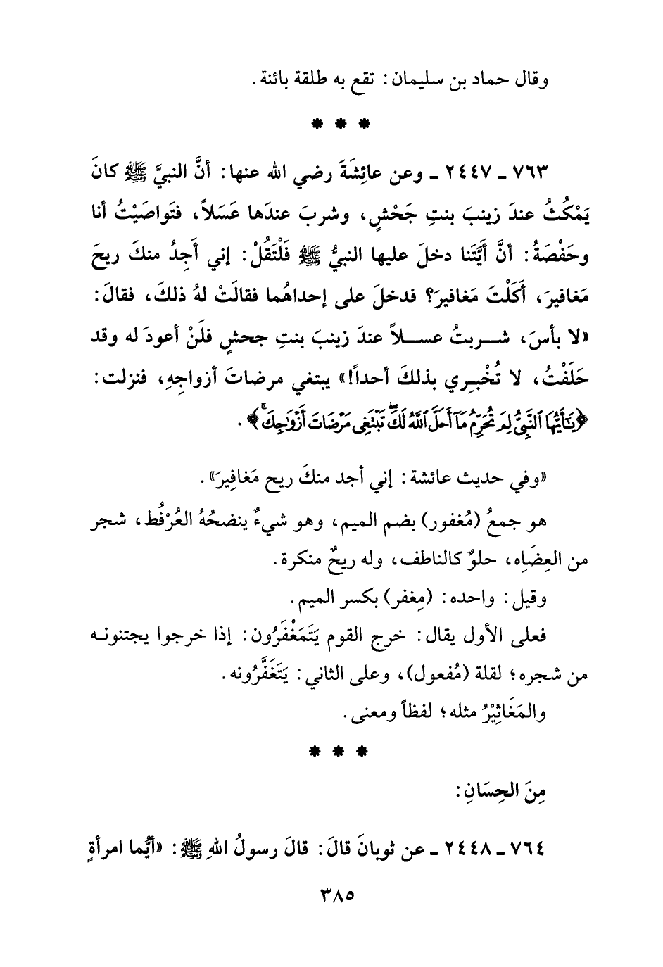 763 – 2447 – وعن عائشة رضي الله عنها: أن النبي صلى الله عليه وسلم كان يمكث عند زينب بنت جحش, وشرب عندها عسلا, فتواصيت أنا وحفصة: أن أيتنا دخل عليها النبي صلى الله عليه وسلم فلتقل: إني أجد منك ربح مغافير, أكلت مغافير؟ فدخل على إحداهما فقالت له ذلك, فقال: " لا بأس, شربت عسلا عند زينب بنت جحش فلن أعود له وقد حلفت, لا تخبري بذلك أحدا! " يبتغي مرضات أزواجه, فنزلت: {ياأيها النبي لم تحرم ما أحل الله لك تبتغي مرضات أزواجك}.