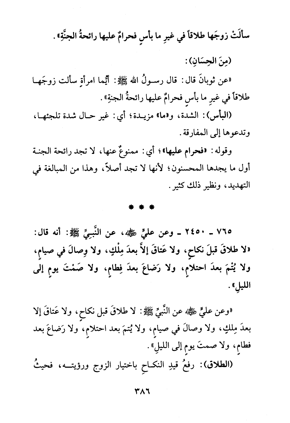 765 – 2450 – وعن علي رضي الله عنه, عن النبي صلى الله عليه وسلم: أنه قال: " لا طلاق قبل نكاح, ولا عتاق إلا بعد ملك, ولا وصال في صيام, ولا يتم بعد احتلام, ولا رضاع بعد فطام, ولا صمت يوم إلى الليل ".