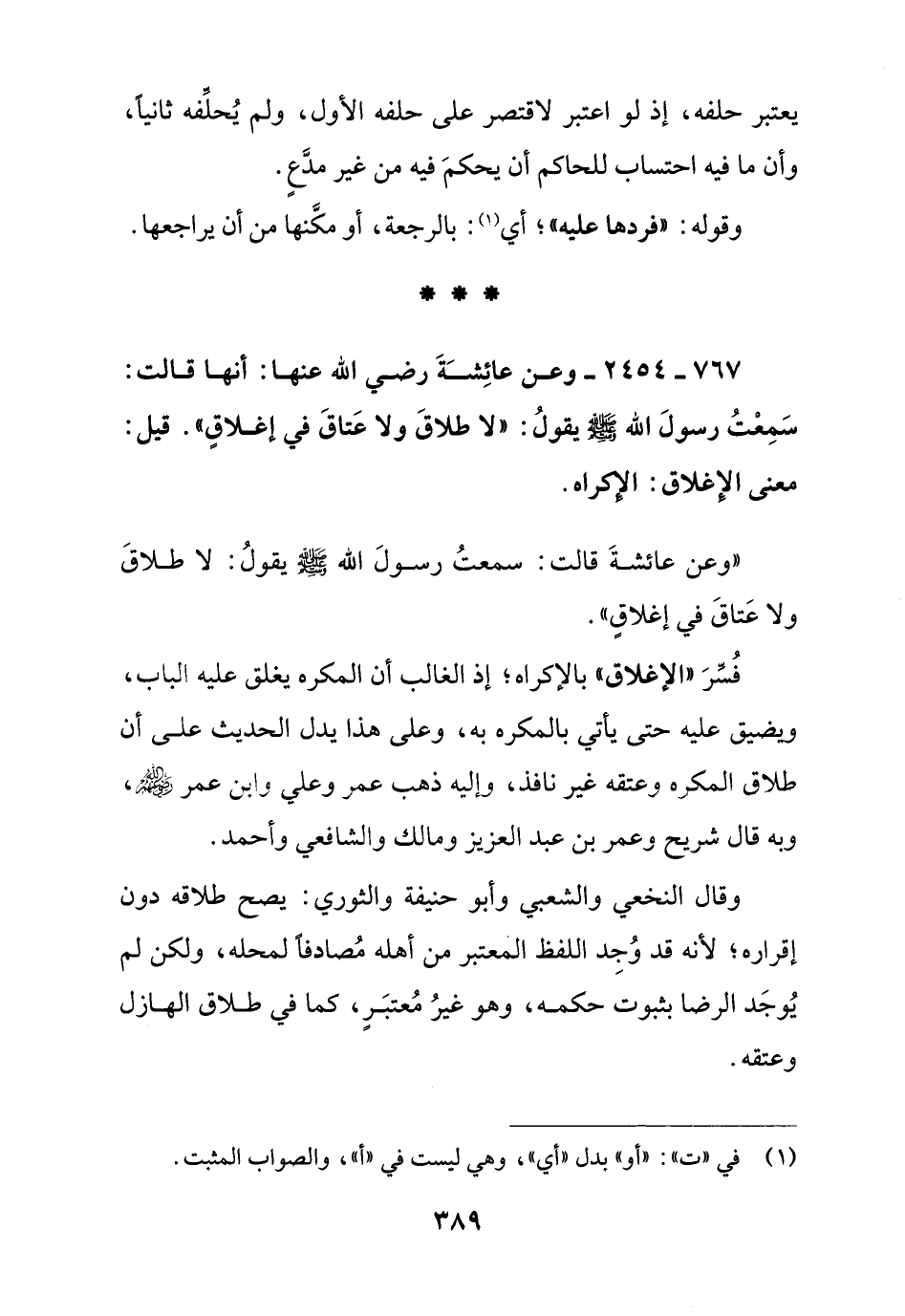 767 – 2454 – وعن عائشة رضي الله عنها: أنها قالت: سمعت رسول الله صلى الله عليه وسلم يقول: " لا طلاق ولا عتاق في إغلاق ". قيل " معنى الإغلاق: الإكراه.