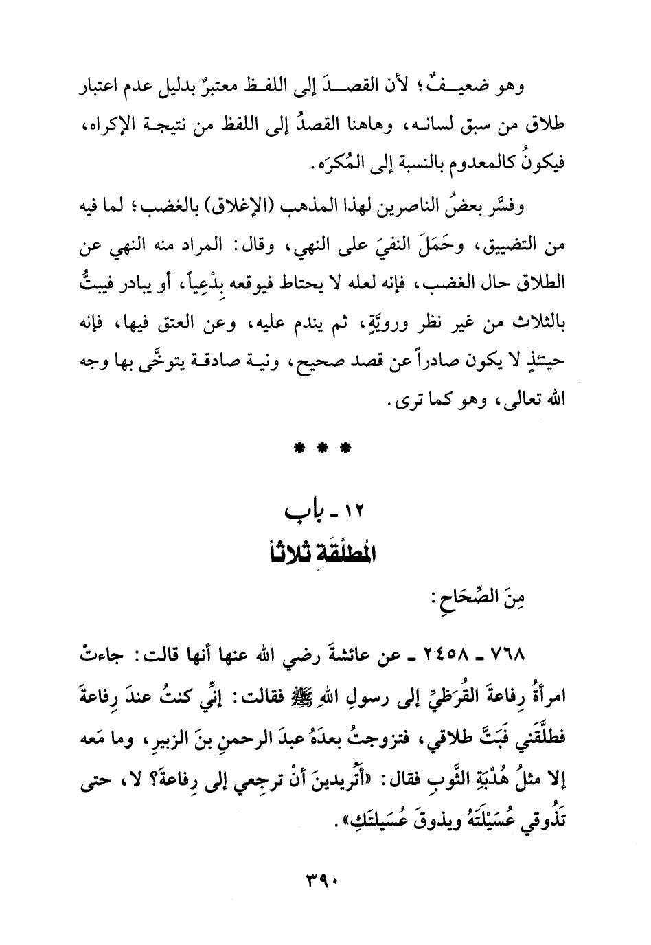 768 - 2458 - عن عائشة رضي الله عنها أنها قالت: جاءت امرأة رفاعة القرظي إلى رسول الله صلى الله عليه وسلم فقالت: إني كنت عند رفاعة فطلقني فبت طلاقي, فتزوجت بعده عبد الرحمن بن الزبير, وما معه إلا مثل هدبة الثوب فقال: " أتريدين أن ترجعي إلى رفاعة؟ لا, حتى تذوقي عسيلته ويذوق عسيلتك ".
