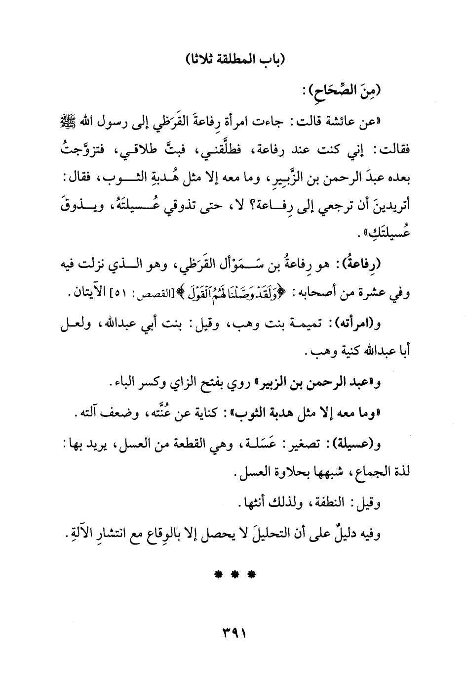 " عن عائشة قالت: جاءت امرأة رفاعة القرظي إلى رسول الله صلى الله عليه وسلم فقالت: إني كنت عند رفاعة, فطلقني, فبت طلاقي, فتزوجت بعده عبد الرحمن بن الزبير, وما معه إلا مثل هدبة الثوب, فقال: أتريدين أن ترجعي إلى رفاعة؟ لا, حتى تذوقي عسيلته, ويذوق عسيلتك ".