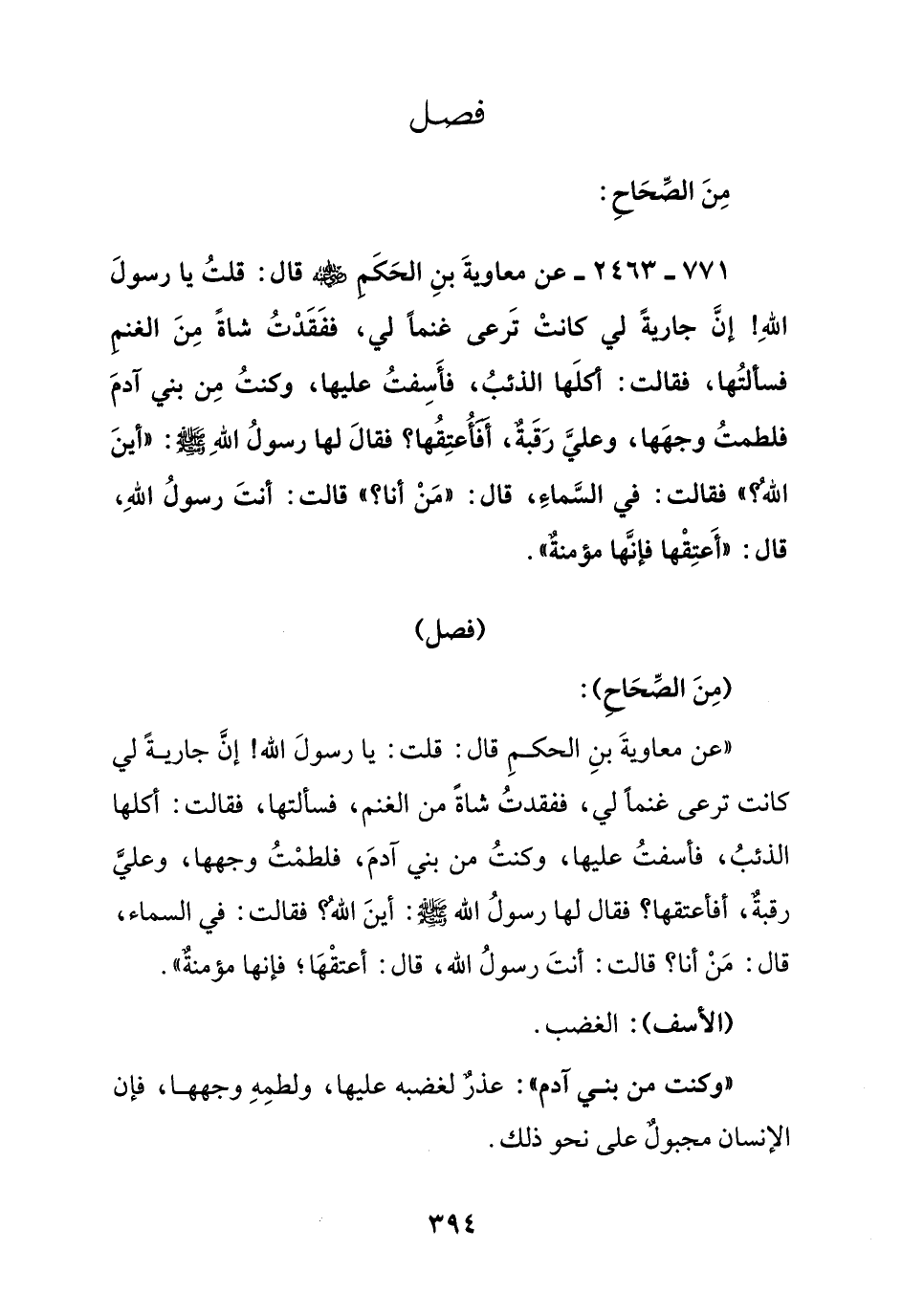 771 - 2463 - عن معاوية بن الحكم رضي الله عنه قال: قلت يا رسول الله! إن جارية لي كانت ترعى غنما لي, ففقدت شاة من الغنم فسألتها, فقالت: أكلها الذئب, فأسفت عليها, وكنت من بني آدم فلطمت وجهها, وعلى رقبة, أفأعتقها؟ فقال رسول الله صلى الله عليه وسلم: " أين الله؟ فقالت: في السماء, قال: " من أنا؟ قالت: أنت رسول الله, قال: " أعتقها فإنها مؤمنة ".