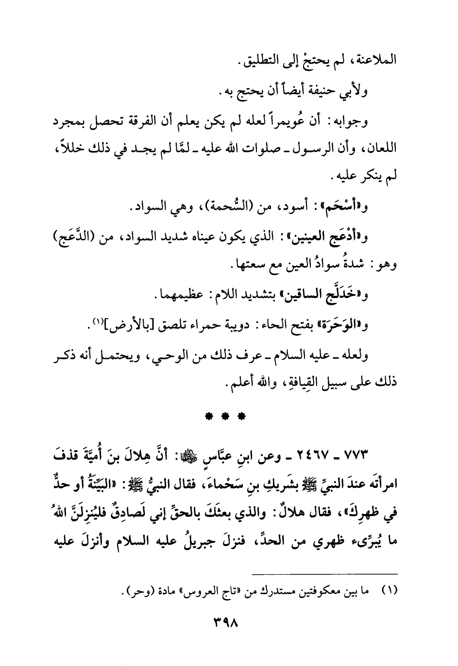 773 - 2467 - وعن ابن عباس رضي الله عنهما: أن هلال بن أمية قذف امرأته عند النبي صلى الله عليه وسلم بشريك بن سحماء, فقال النبي صلى الله عليه وسلم: " البينة أو حد في ظهرك " فقال هللا: والذي بعثك بالحق إني لصادق فلينزلن الله ما يبرئ ظهري من الحد, فنزل جبريل عليه السلام وأنزل عليه