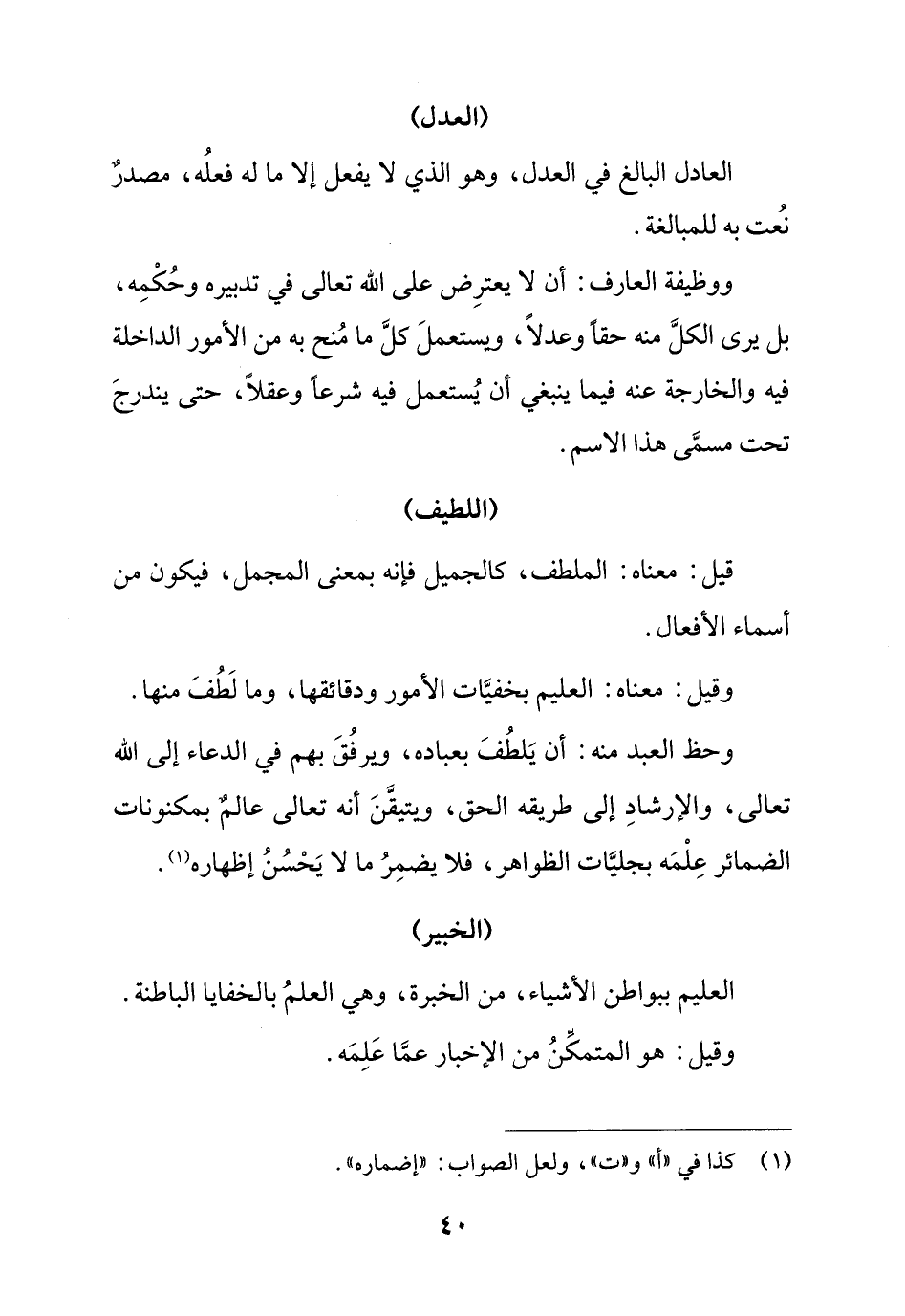 ووظيفة العارف: أن لا يعترض على الله تعالى في تدبيره وحكمه, بل يرى الكل منه حقا وعدلا, ويستعمل كل ما منح به من الأمور الداخلة فيه والخارجة عنه فيما ينبغي أن يستعمل فيه شرعا وعقلا, حتى يندرج تحت مسمى هذا الاسم.