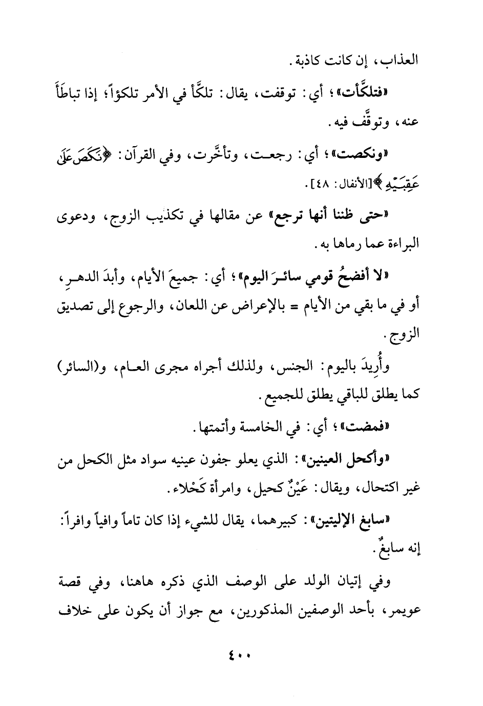 " لا أفضح قومي سائر اليوم " أي: جميع الأيام, وأبد الدهر, أو في مابقي من الأيام = بالإعراض عن اللعان, والرجوع إلى تصديق الزوج.