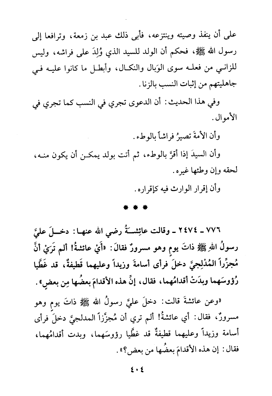 776 - 2474 - وقالت عائشة رضي الله عنها: دخل علي رسول الله صلى الله عليه وسلم ذات يوم وهو مسرور فقال: " أي عائشة! ألم تري أن مجزرا [مجززا] المدلجي دخل فرأى أسامة وزيدا وعليهما قطيفة, قد غطيا رؤوسهما وبدت أقدامهما, فقال: إن هذه الأقدام بعضها من بعض ".