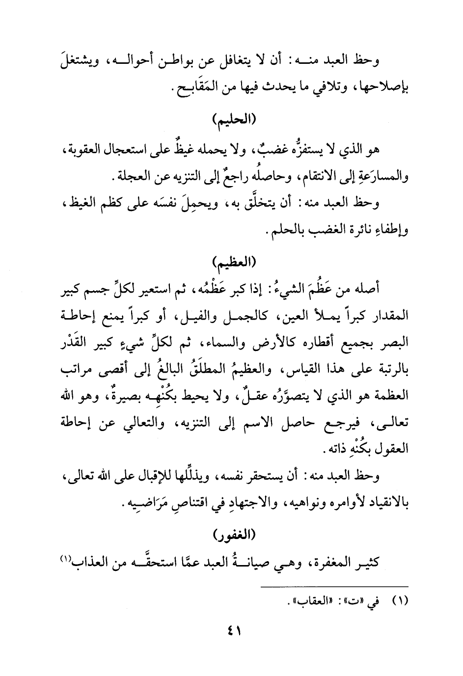 وحظ العبد منه: أن لا يتغافل عن بواطن أحواله, ويشتغل بإصلاحها, وتلافي ما يحدث فيها من المقابح.