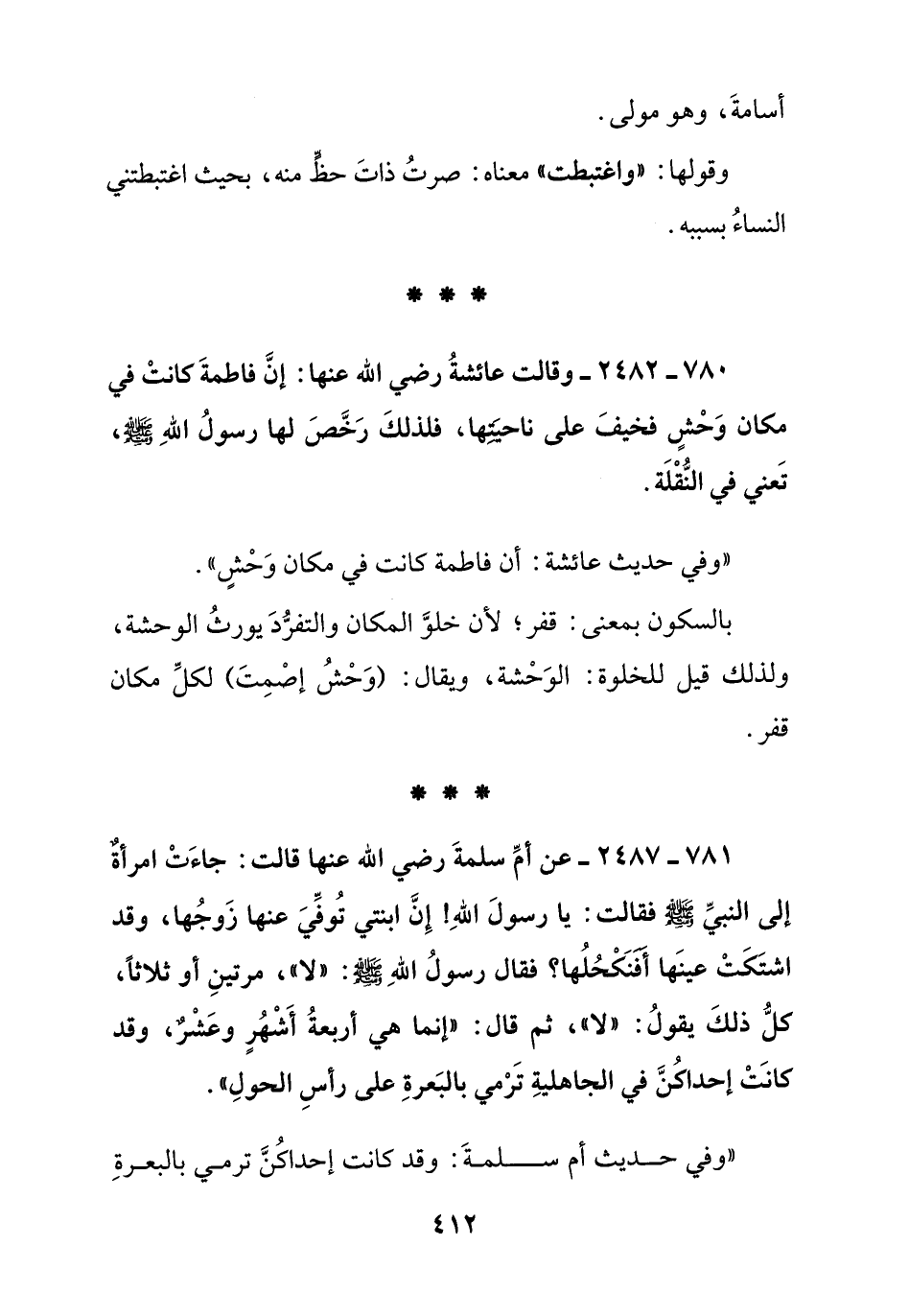 781 - 2487 - عن أم سلمة رضي الله عنها قالت: جاءت امرأة إلى النبي صلى الله عليه وسلم فقالت: يا رسول الله! إن ابنتي توفي عنها زوجها, وقد اشتكت عينها أفنكحلها؟ فقال رسول الله صلى الله عليه وسلم: " لا " مرتين أو ثلاثا, كل ذلك يقول: " لا " ثم قال: " إنما هي أربعة أشهر وعشر, وقد كانت إحداكن في الجاهلية ترمي بالبعرة على رأس الحول ".