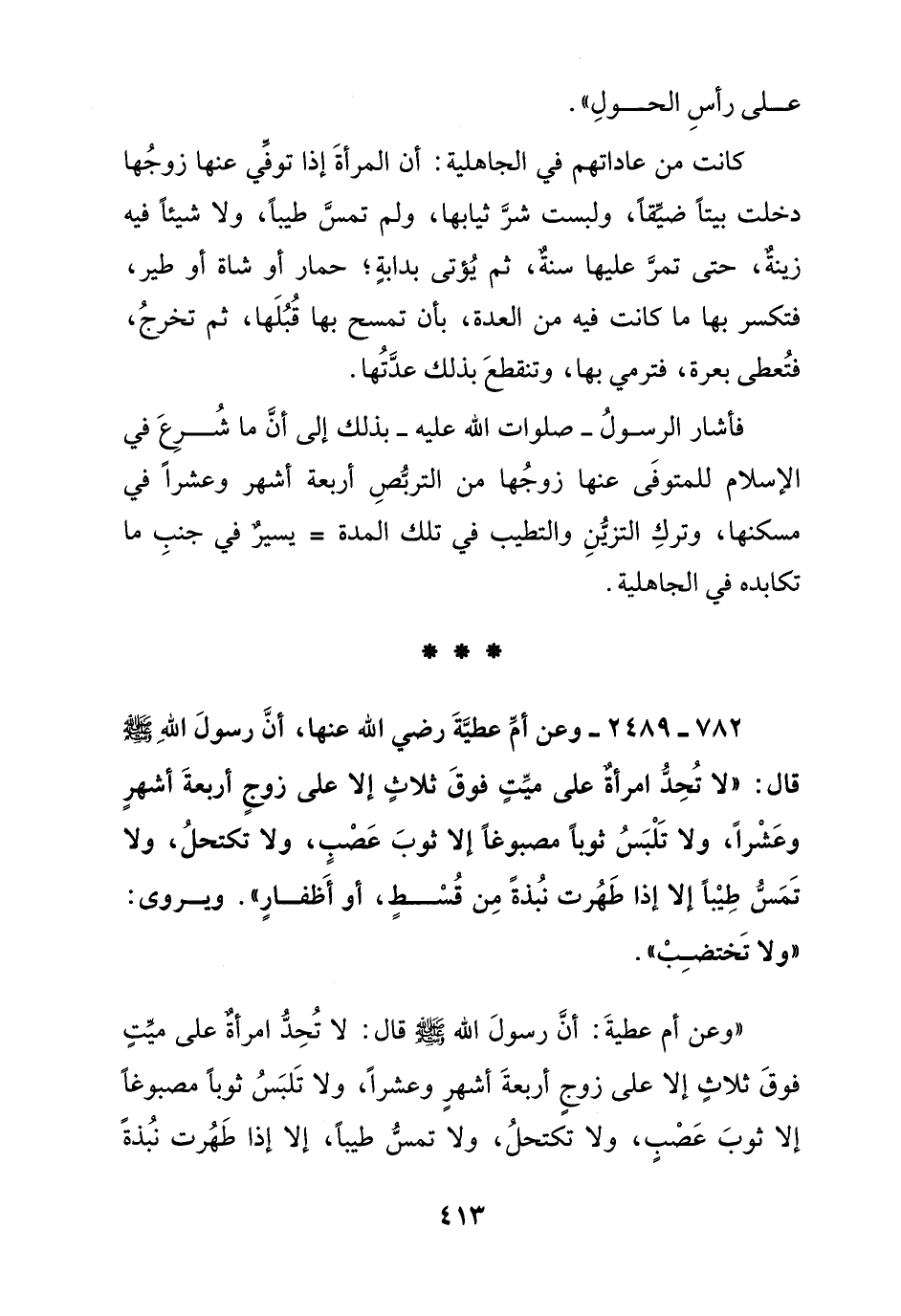 782 - 2489 - وعن أم عطية رضي الله عنها, أن رسول الله صلى الله عليه وسلم قال: " لا تحد امرأة على ميت فوق ثلاث إلا على زوج أربعة أشهر وعشرا, ولا تلبس ثوبا مصبوغا إلا ثوب عصب, ولا تكتحل, ولا تمس طيبا إلا إذا طهرت نبذة من قسط, أو أظفار ". ويروى:" ولا تختضب ".
