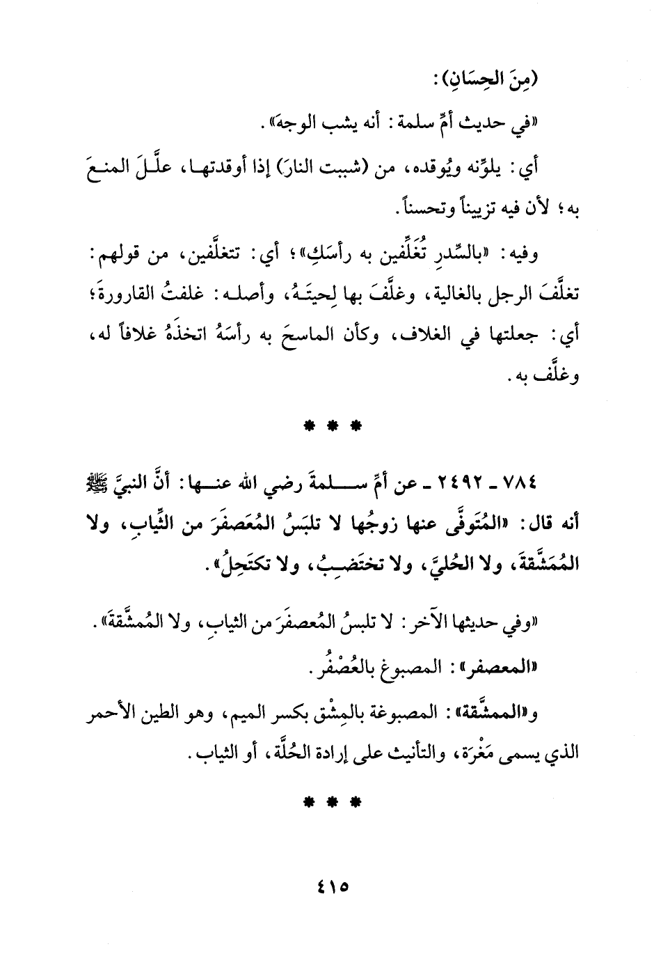 784 - 2492 - عن أم سلمة رضي الله عنها: أن النبي صلى الله عليه وسلم أنه قال: " المتوفى عنها زوجها لا تلبس المعصفر من الثياب, ولا الممشقة, ولا الحلي, ولا تختضب, ولا تكتحل ".