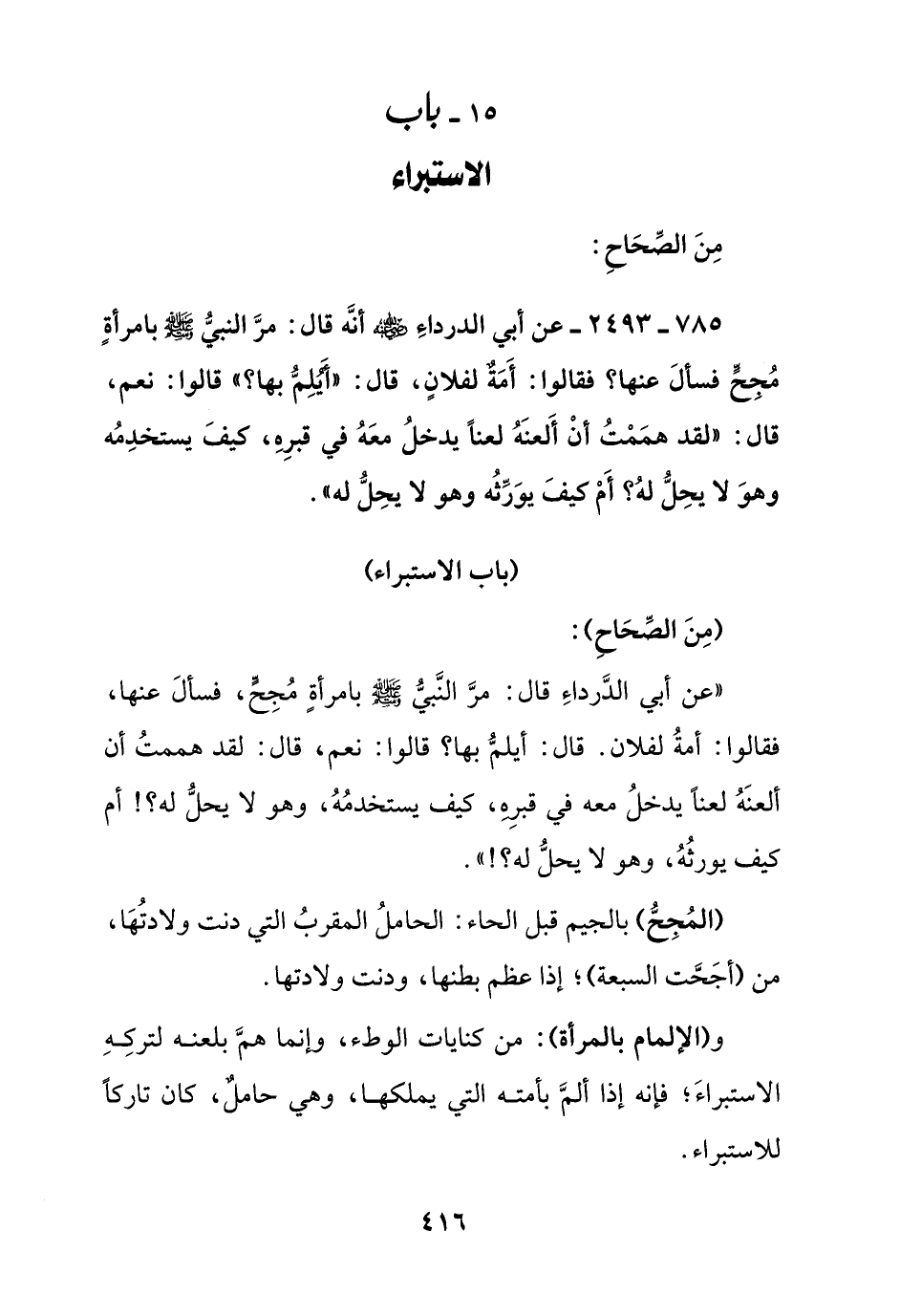 785 - 2493 - عن أبي الدرداء رضي الله عنه أنه قال: مر النبي صلى الله عليه وسلم بامرأة مجح فسأل عنها؟ فقالوا: أمة لفلان, قال: " أيلم بها؟ " قالوا: نعم, قال: " لقد هممت أن ألعنه لعنا يدخل معه في قبره, كيف يستخدمه وهو لا يحل له؟ أم كيف يورثه وهو لا يحل له "