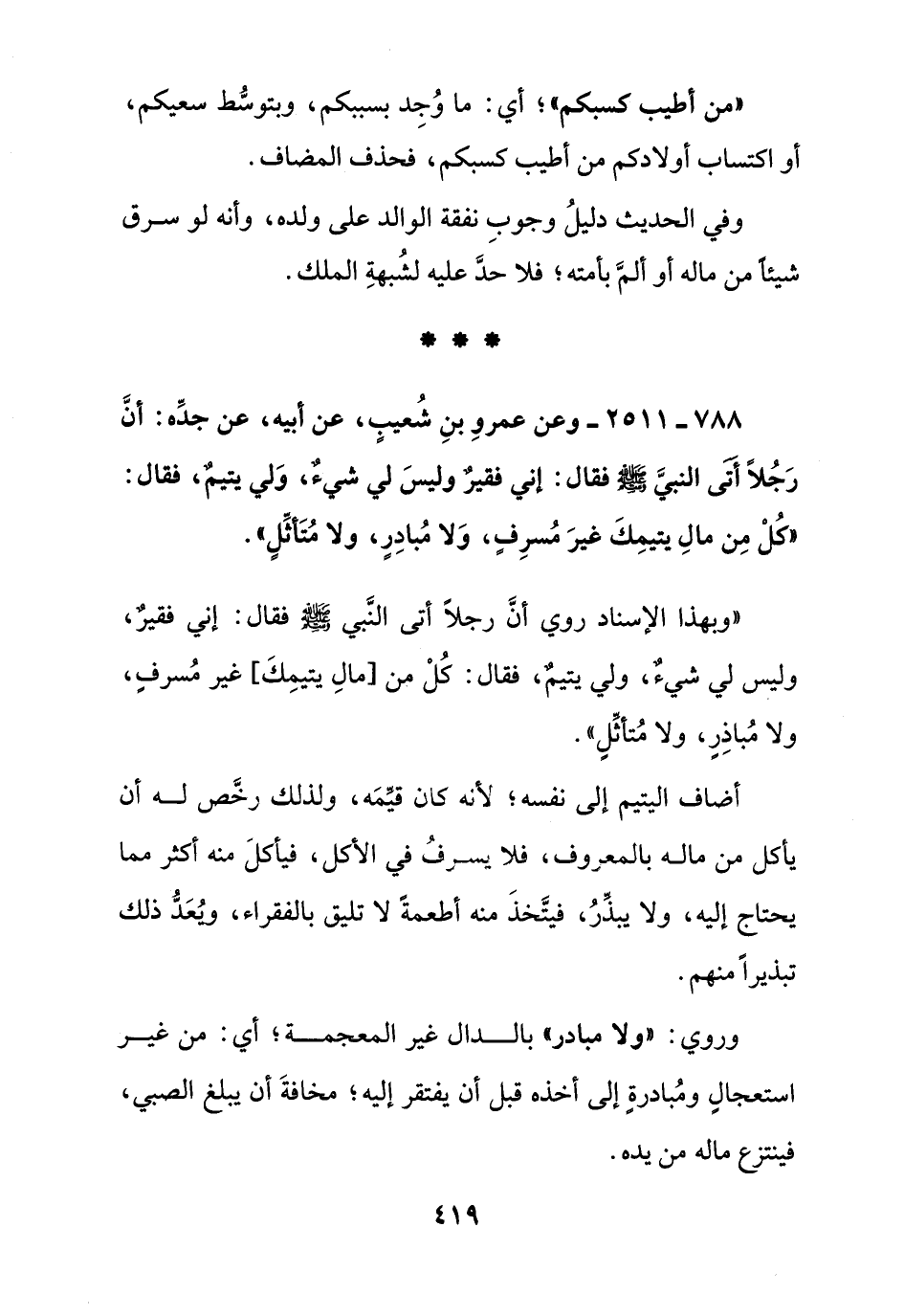 788 - 2511 - وعن عمرو بن شعيب عن أبيه عن جده: أن رجلا أتى النبي صلى الله عليه وسلم فقال: إني فقير وليس لي شيء, ولي يتيم, فقال: " كل من مال يتيمك غير مسرف, ولا مبادر, ولا متأثل ".