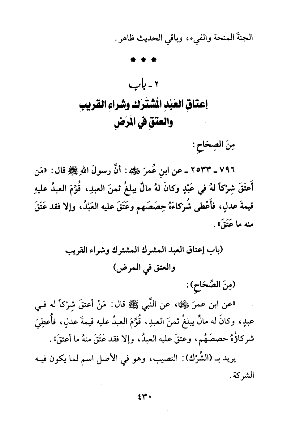 796 - 2533 - عن ابن عمر رضي الله عنه: أن رسول الله صلى الله عليه وسلم قال: " من أعتق شركا له من عبد وكان له مال يبلغ ثمن العبد, قوم العبد عليه قيمة عدل ' فأعطى شركاءه حصصهم وعتق عليه العبد, وإلا فقد عتق منه ما عتق ".