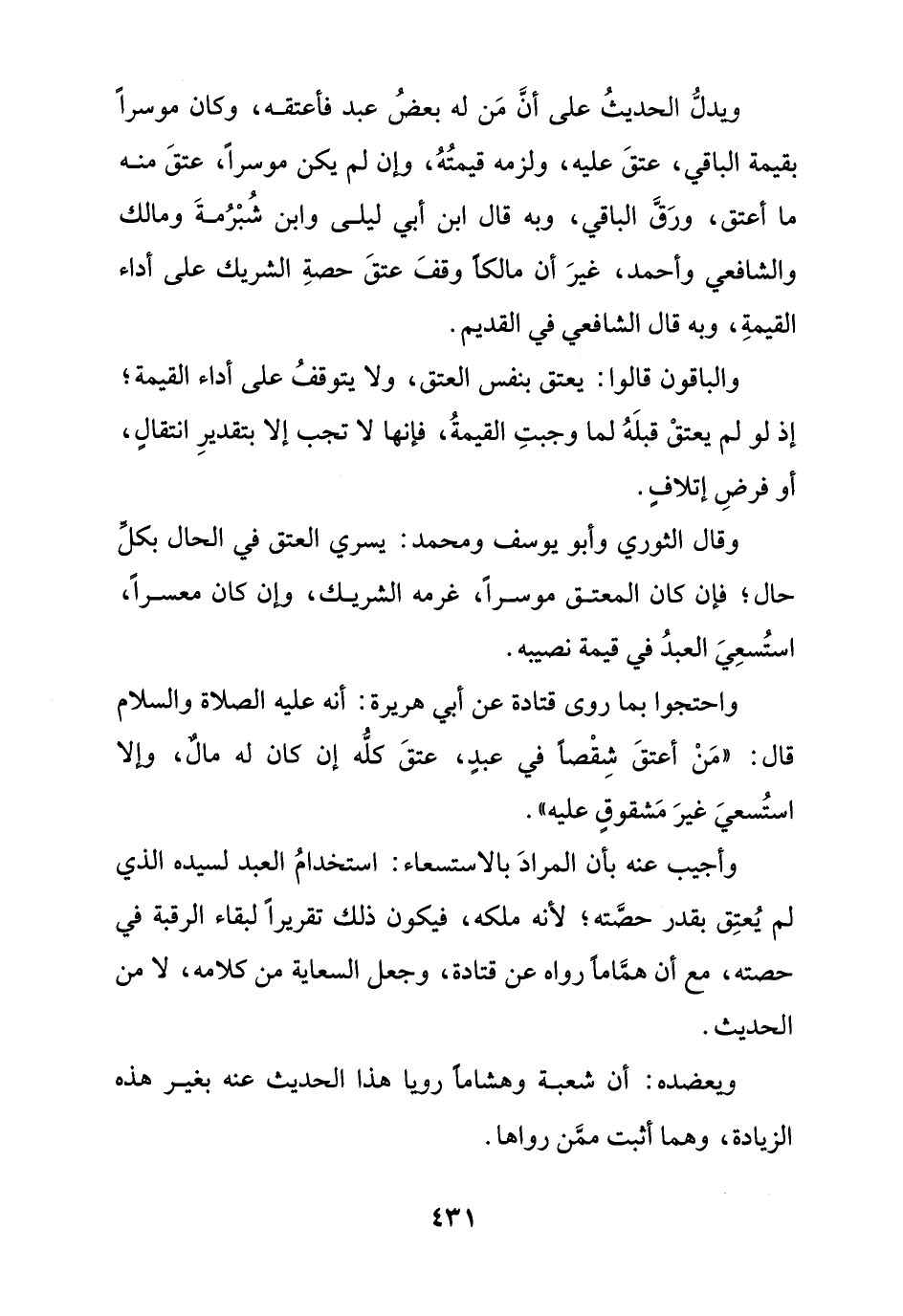 واحتجوا بما روى قتادة عن أبي هريرة: أنه عليه الصلاة والسلام قال: " من أعتق شقصا في عبد, عتق كله إن كان له مال, وإلا استسعى غير مشقوق عليه ".