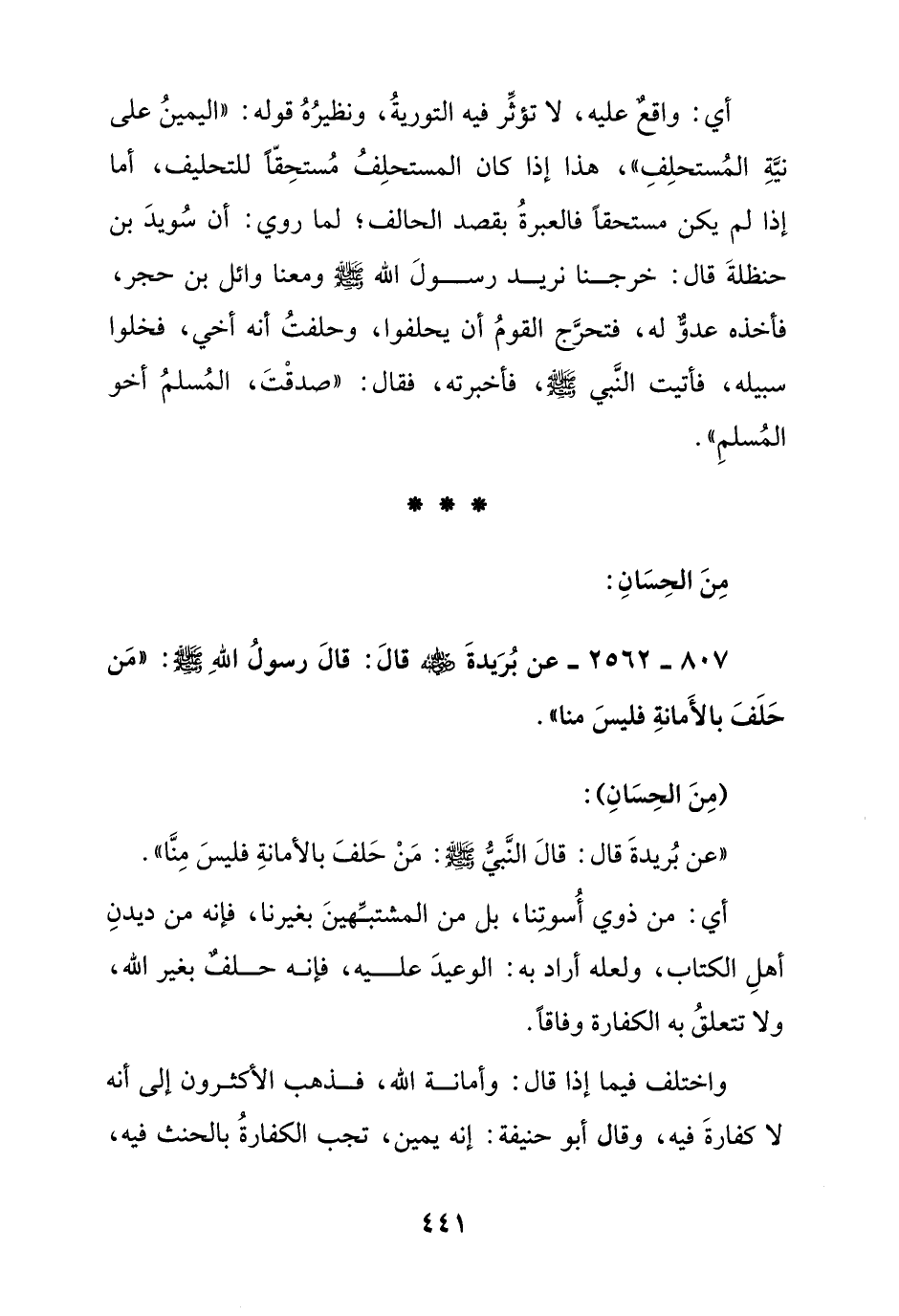 807 - 2562 - عن بريدة رضي الله عنه قال: قال رسول الله صلى الله عليه وسلم: " من حلف بالأمانة فليس منا "