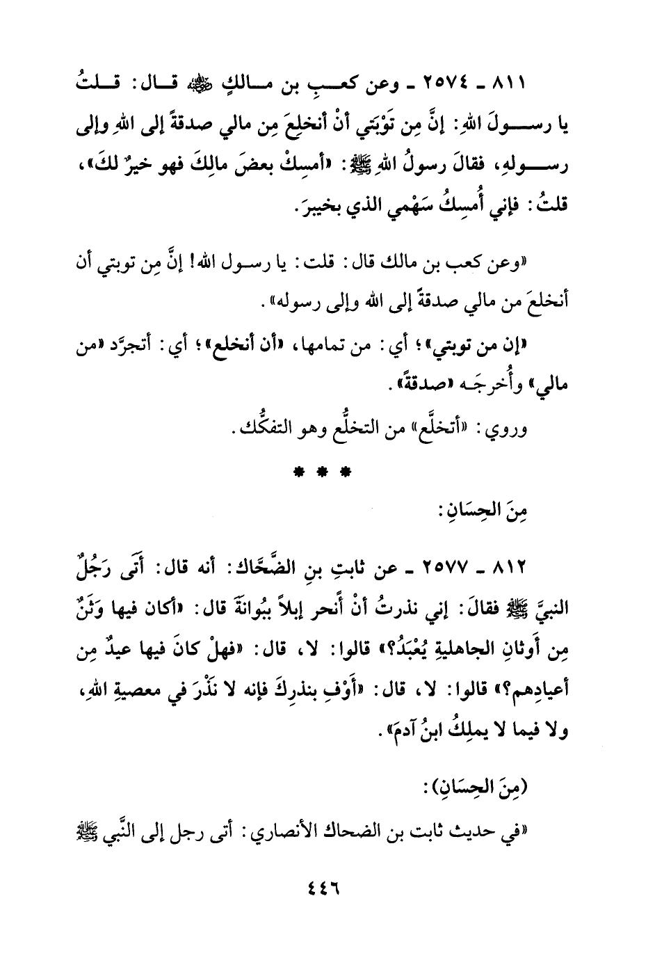 811 - 2574 – وعن كعب بن مالك رضي الله عنه قال: قلت: يا رسول الله: إن من توبتي أن أنخلع من مالي صدقة إلى الله وإلى رسوله, فقال رسول الله صلى الله عليه وسلم: " أمسك بعض مالك فهو خير لك " قلت: فإني أمسك سهمي الذي بخيبر "
