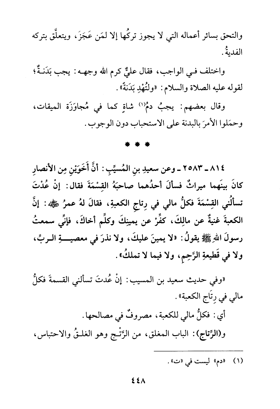814 – 2583 – وعن سعيد بن المسيب: أن أخوين من الأنصار كان بينهما ميراث فسأل أحدهما صاحبه القسمة فقال: إن عدت تسألني القسمة فكل مالي في رتاج الكعبة, فقال له عمر رضي الله عنه: إن الكعبة غنية عن مالك, كفر عن يمينك وكلم أخاك, فإني سمعت رسول الله صلى الله عليه وسلم يقول: " لا يمين عليك, ولا نذر في معصية الرب, ولا في قطيعة رحم, ولا فيما لا يملك "