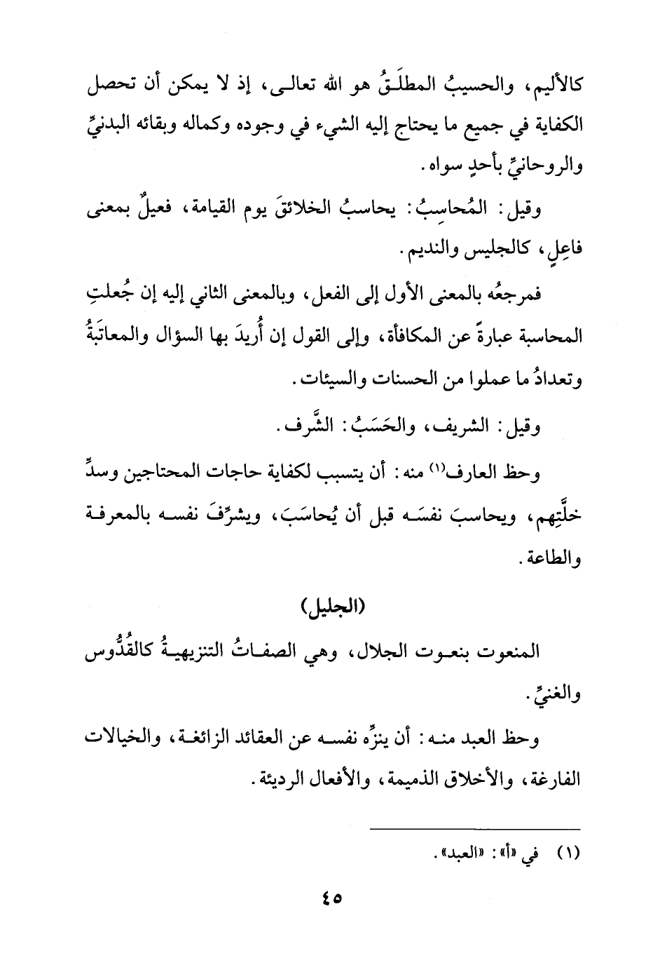 كالأليم, والحسيب المطلق هو الله تعالى, إذ يمكن أن تحصل الكفاية في جميع ما يحتاج إليه الشيء في وجوده وكماله وبقائه البدني والروحاني بأحد سواه.