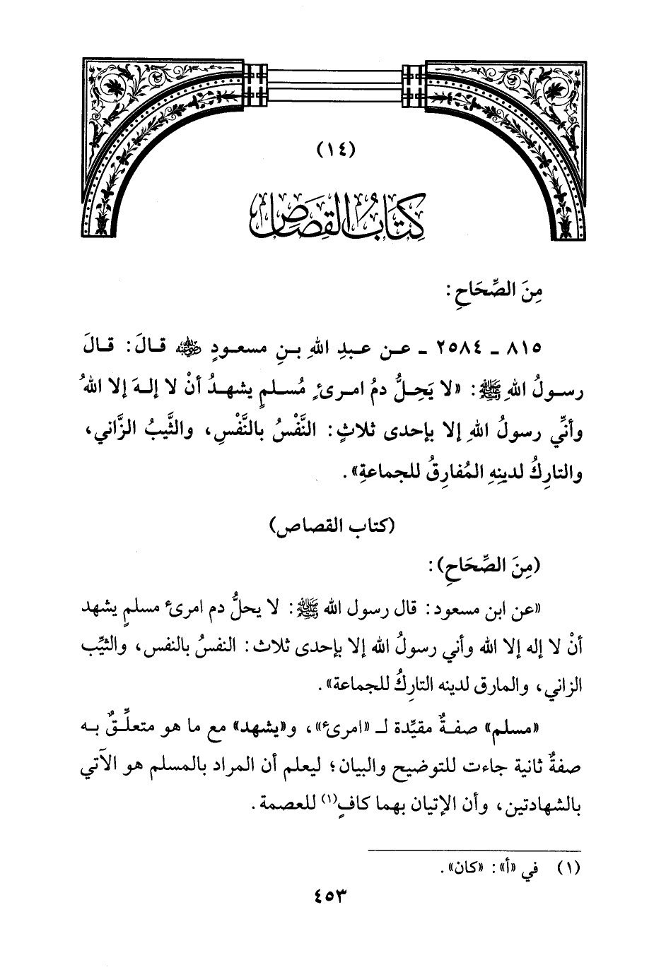 815 - 2584 - عن عبد الله بن مسعود رضي الله عنه قال: قال رسول الله صلى الله عليه وسلم: " لا يحل دم امرئ مسلم يشهد أن لا إله إلا الله وأني رسول الله إلا بإحدى ثلاث: النفس بالنفس, والثيب الزاني, والترك لدينه المفارق للجماعة ".