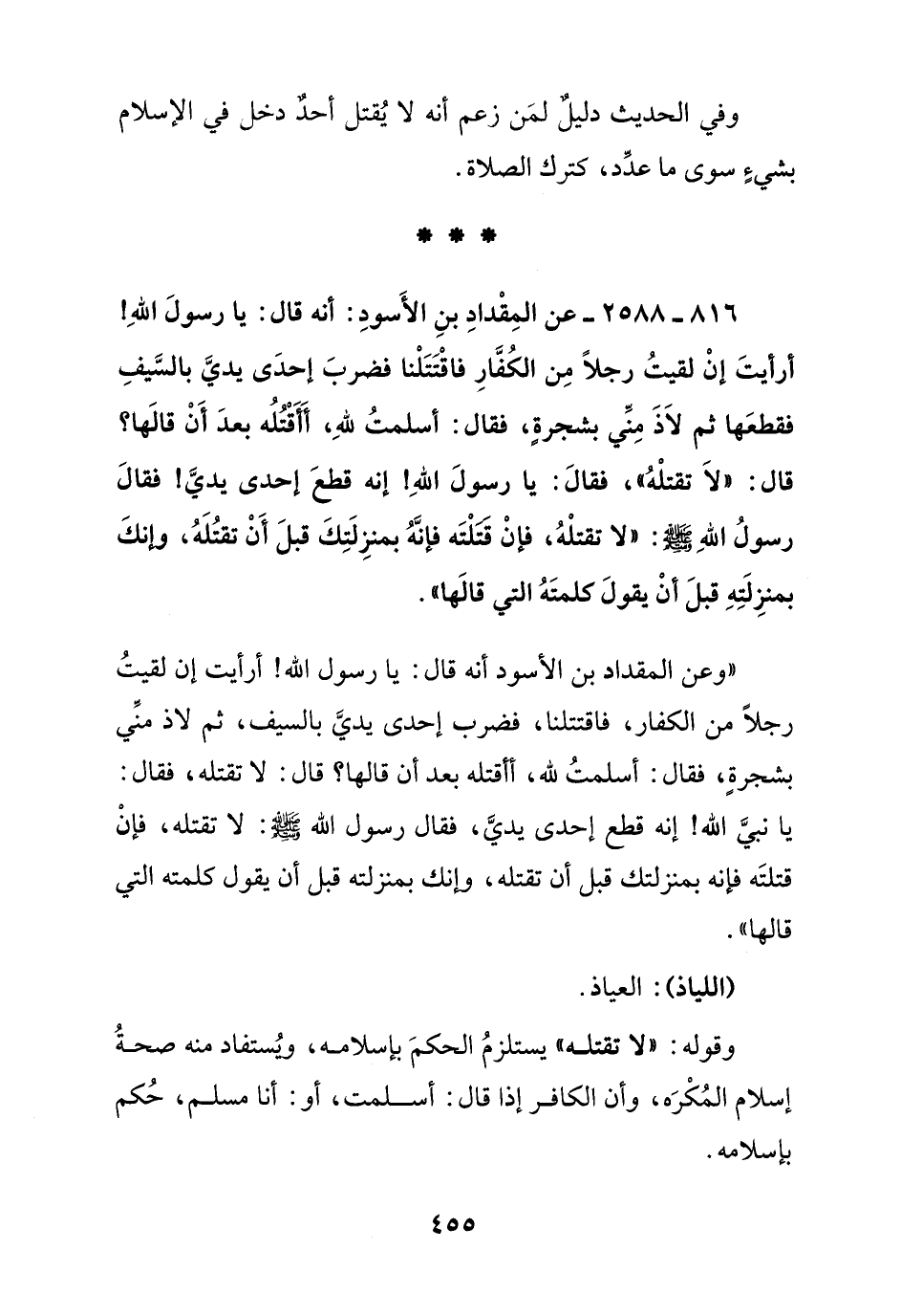 816 - 2588 - عن المقداد بن الأسود: أنه قال: يا رسول الله! أرأيت إن لقيت رجلا من الكفار فاقتتلنا فضرب إحدى يدي بالسيف فقطعها ثم لاذ مني بشجرة, فقال: أسلمت لله, أأقتله بعد أن قالها؟ قال: " لا تقتله " فقال: يا رسول الله! إنه قطع إحدى يدي! فقال رسول الله: " لا تقتله, فإن قتلته فإنه بمنزلك قبل أن تقتله, وإنك بمنزلته قبل أن يقول كلمته التي قالها ".