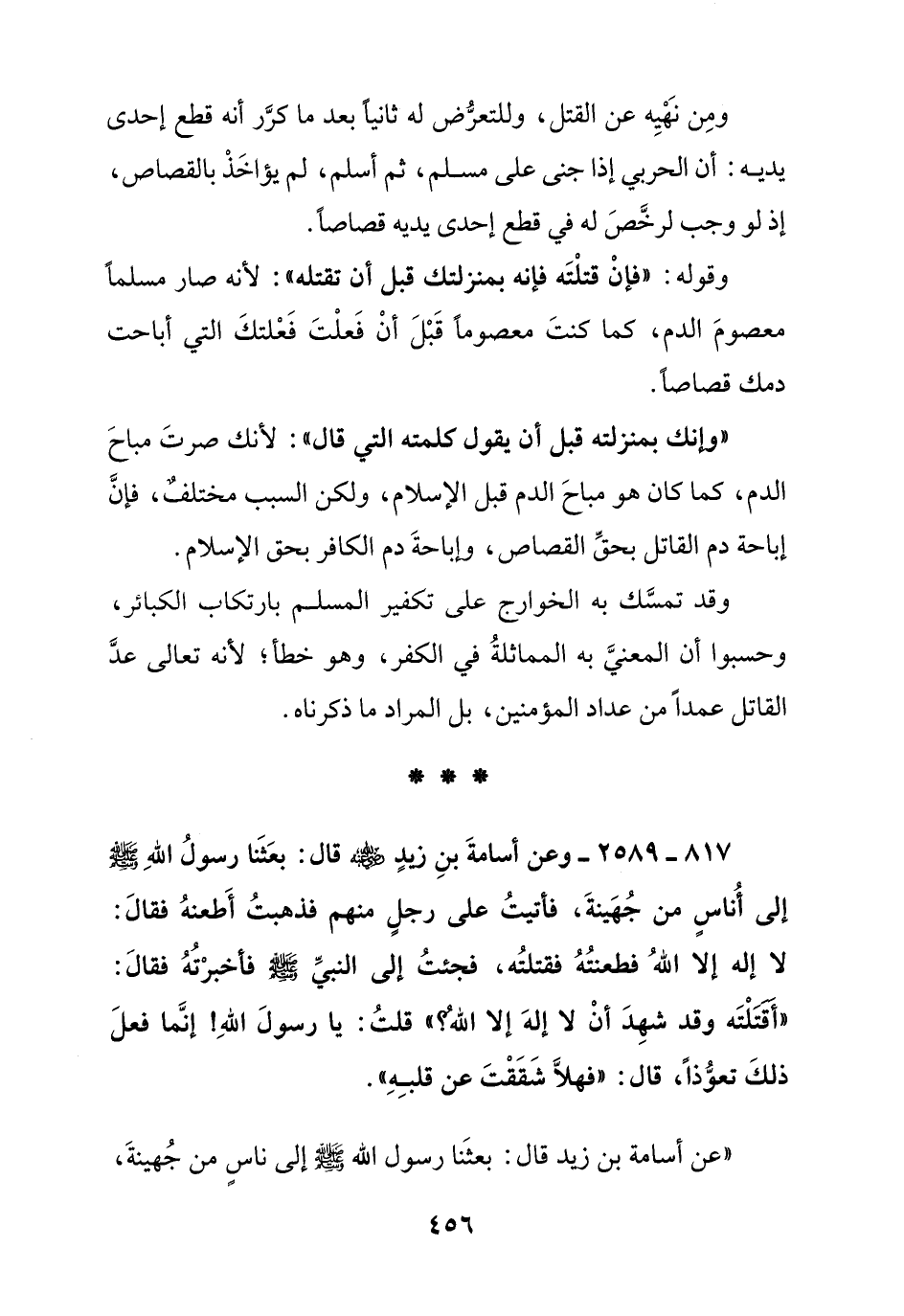817 - 2589 - وعن أسامة بن زيد رضي الله عنه قال: بعثنا رسول الله صلى الله عليه وسلم إلى أناس من جهينة, فأتيت على رجل منهم فذهبت أطعنه فقال: لا إله إلا الله فطعنته فقتلته, فجئت إلى النبي صلى الله عليه وسلم فأخبرته فقال: " أقتلته وقد شهد أن لا إله إلا الله؟ " قلت: يا رسول الله! إنما فعل ذلك تعوذا, قال: " فهلا شققت عن قلبه ".