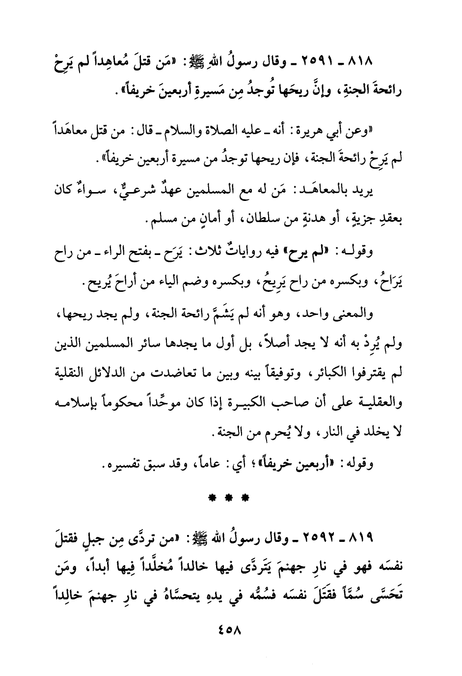 818 - 2591 - وقال رسول الله صلى الله عليه وسلم: " من قتل معاهدا لم يرح رائحة الجنة, وإن ريحها توجد من مسيرة أربعين خريفا "