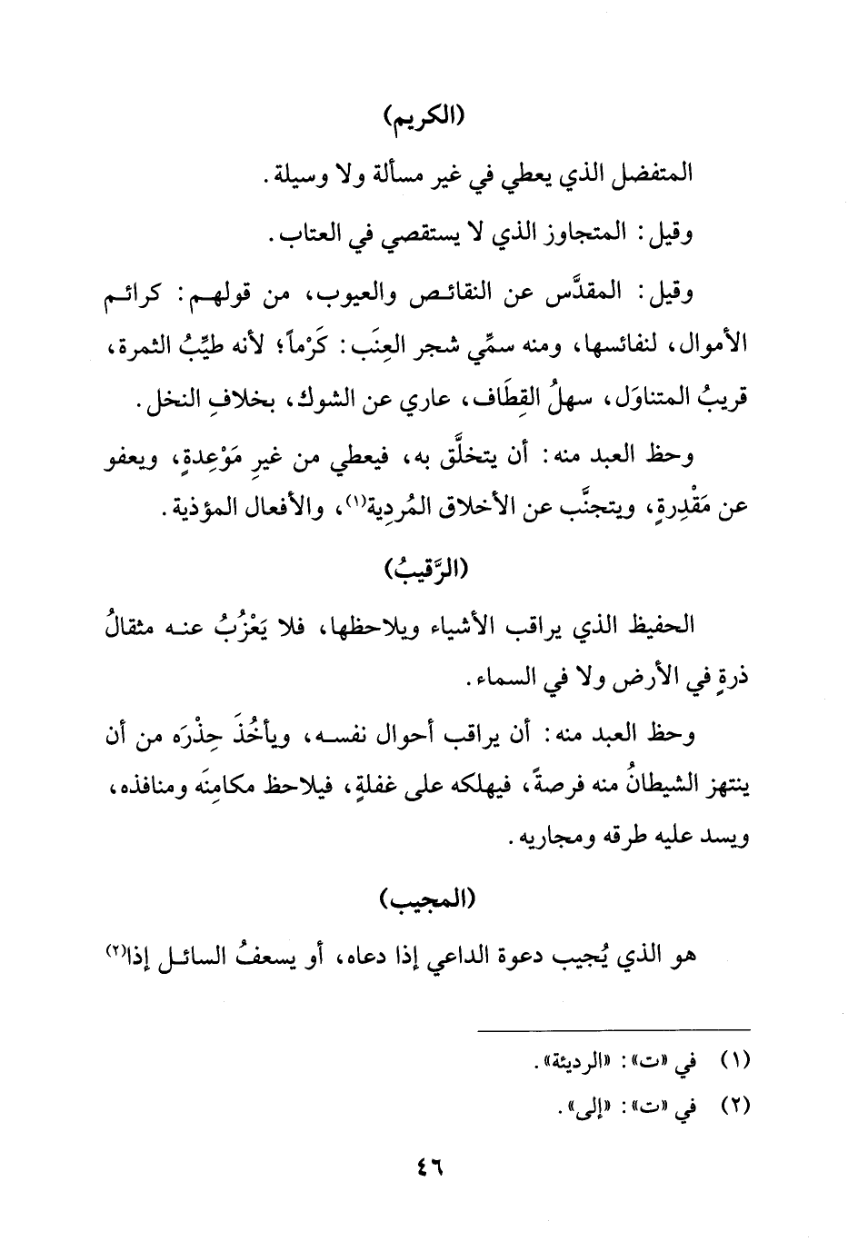 وقيل: المقدس عن النقائص والعيوب, من قولهم: كرائم الأموال لنفائسها, ومنه سمي شجر العنب, كرما, لأنه طيب الثمرة, قريب المتناول, سهل القطاف, عاري عن الشوك, بخلاف النخل.